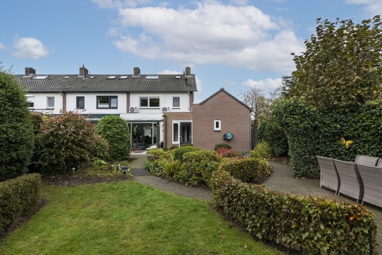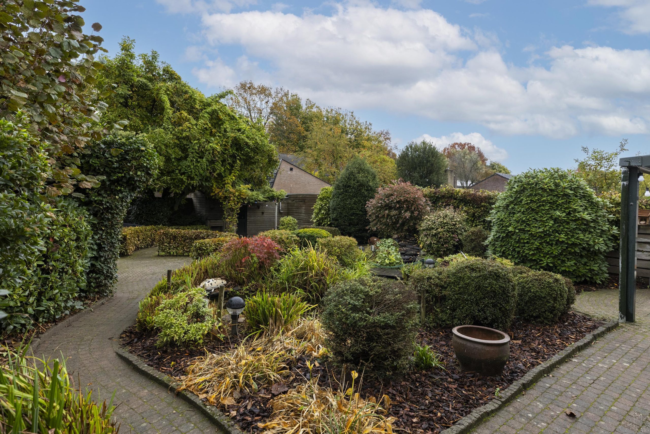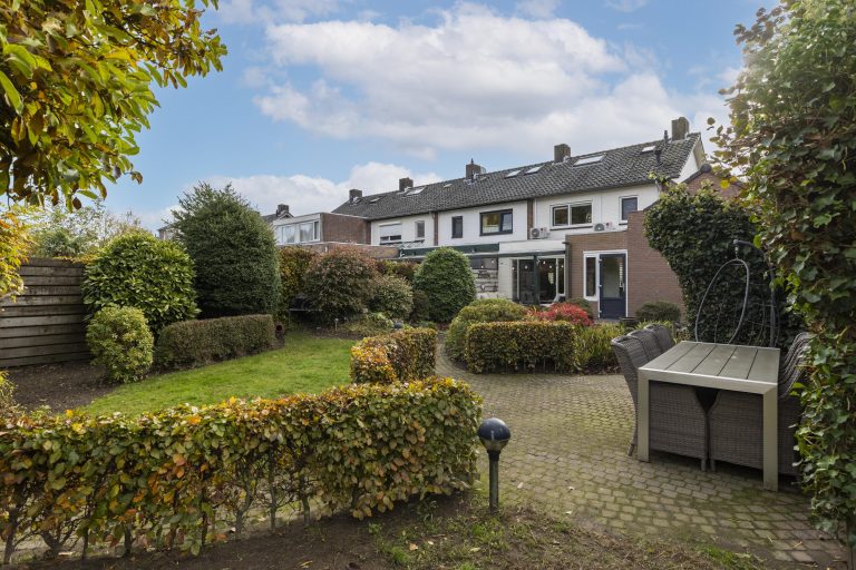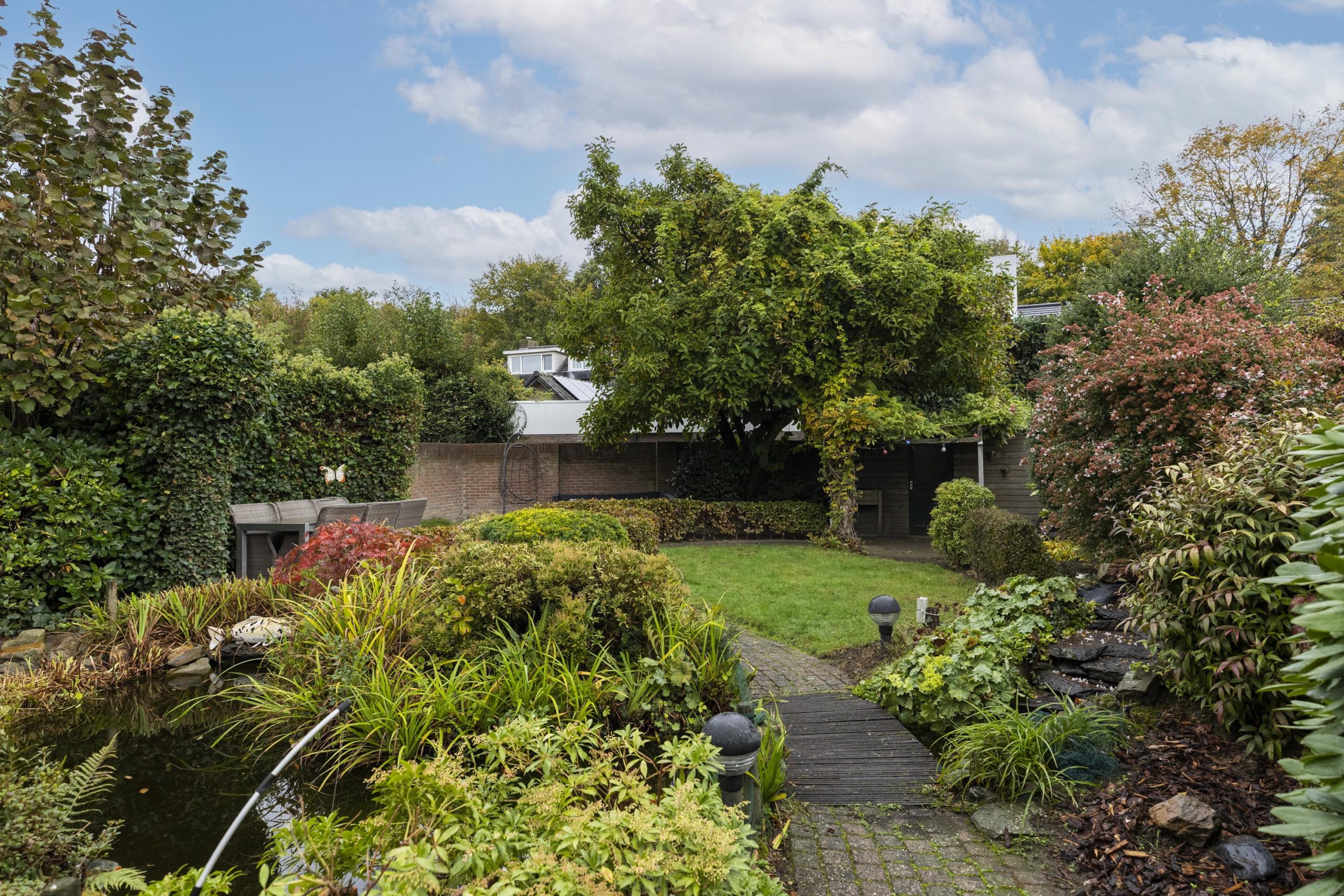 De fraai aangelegde achtertuin is een groene oase van rust en privacy. Direct aan de woning bevindt zich een gezellige overkapping, ideaal voor een ontspannen zitplek. Achter in de tuin staat een houten berging met elektra, met daarnaast een extra zithoek om heerlijk van de zon te genieten. De tuin is rijk beplant met diverse vaste planten en struiken, waaronder een grote magnoliaboom en blauwe regen die in bloei zorgt voor een prachtig kleuraccent. Een vijver en een sierlijk aangelegd pad maken het geheel compleet en geven de tuin een verzorgde, natuurlijke uitstraling. Tevens is de tuin ook bereikbaar via een achterom, perfect voor fietsen en kliko’s.