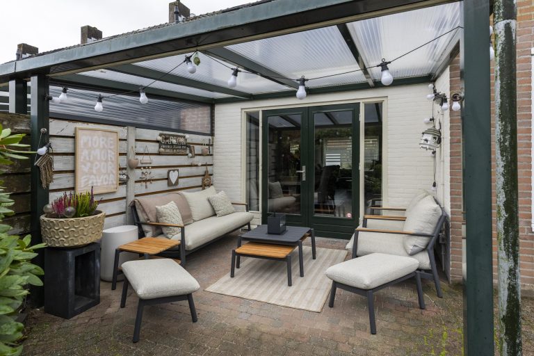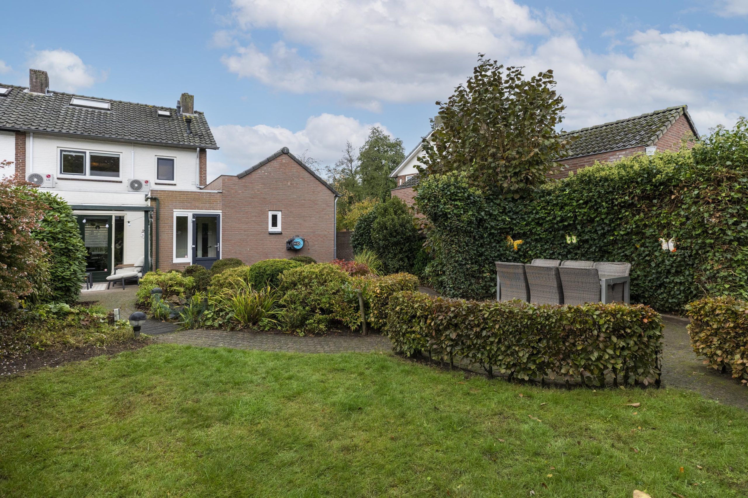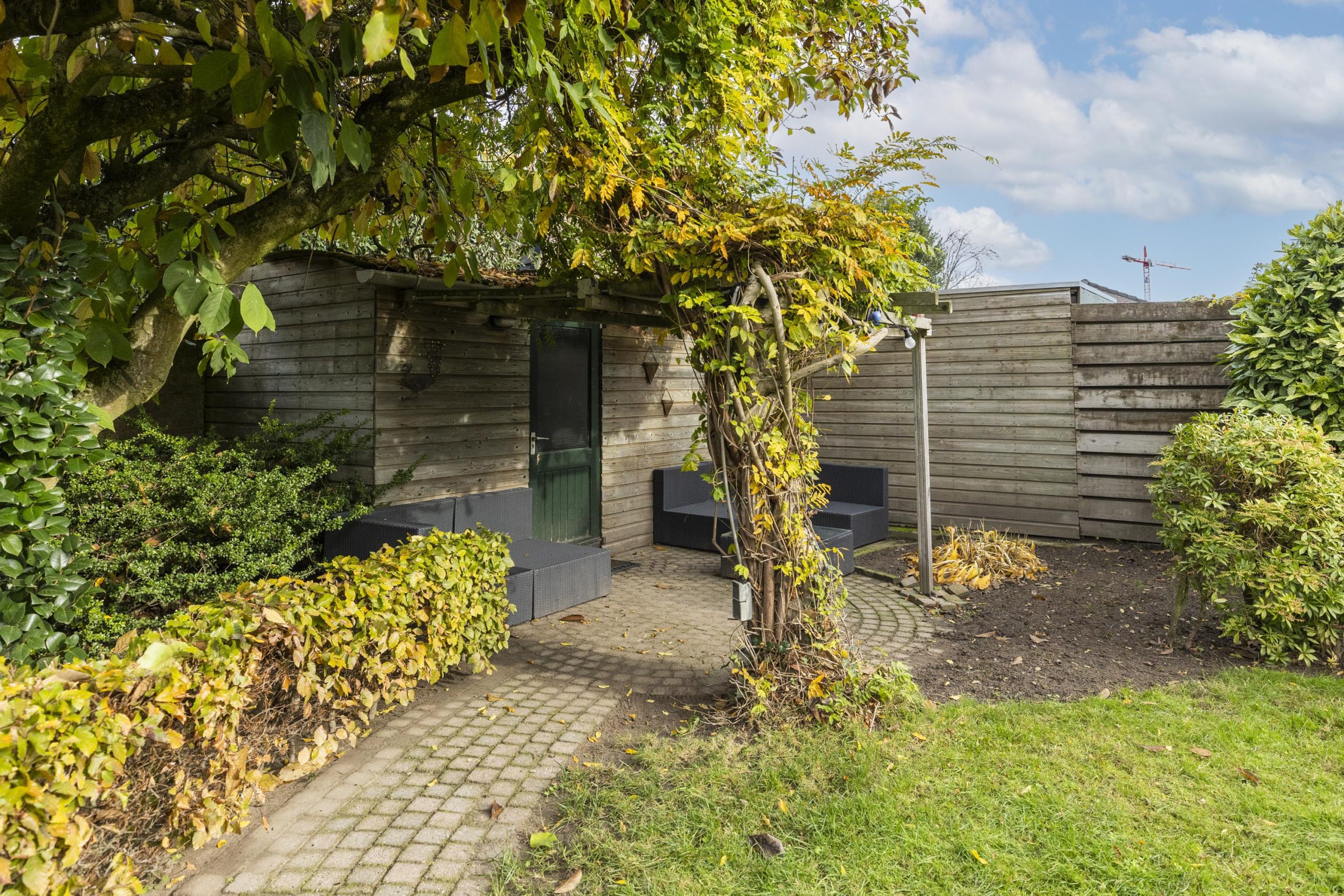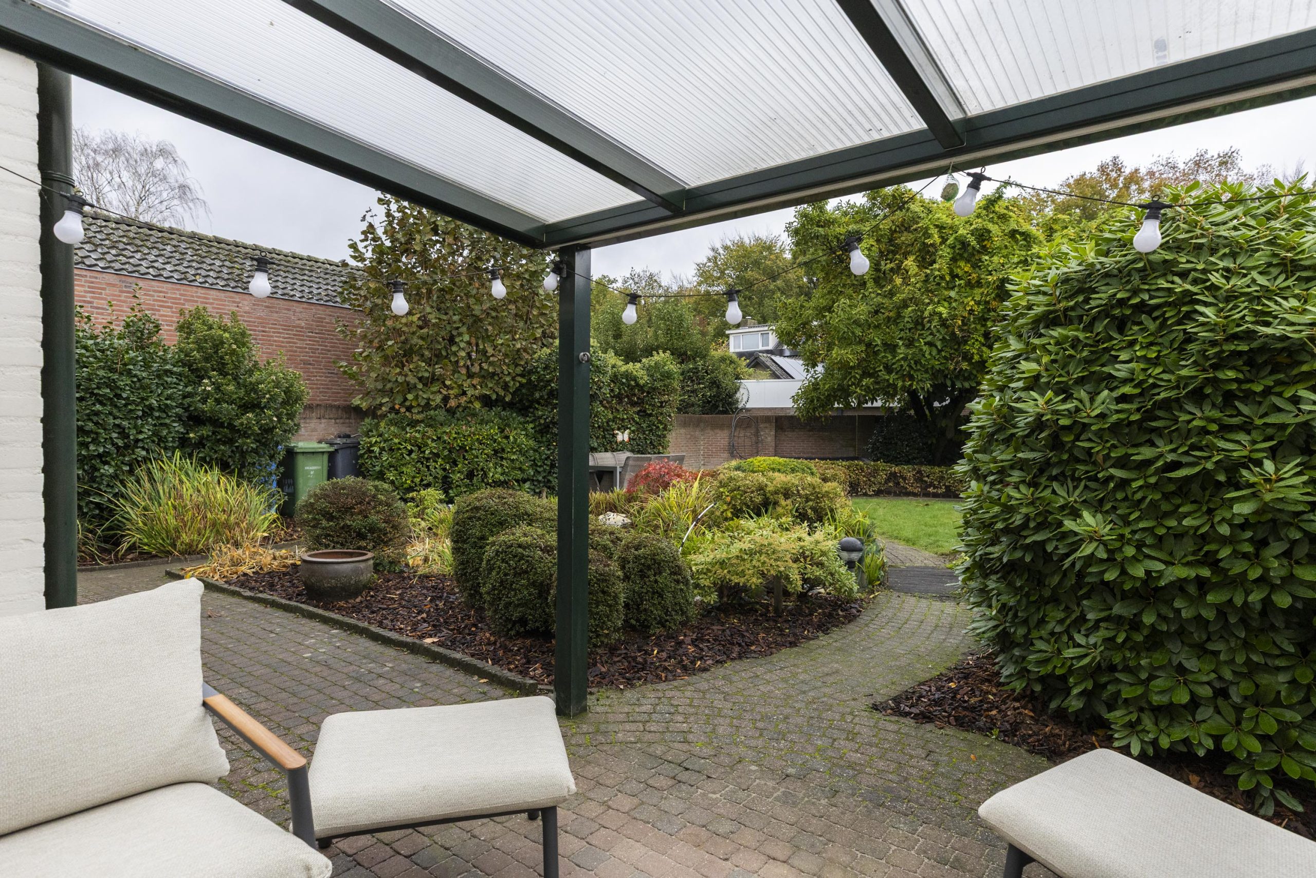 De fraai aangelegde achtertuin is een groene oase van rust en privacy. Direct aan de woning bevindt zich een gezellige overkapping, ideaal voor een ontspannen zitplek. Achter in de tuin staat een houten berging met elektra, met daarnaast een extra zithoek om heerlijk van de zon te genieten. De tuin is rijk beplant met diverse vaste planten en struiken, waaronder een grote magnoliaboom en blauwe regen die in bloei zorgt voor een prachtig kleuraccent. Een vijver en een sierlijk aangelegd pad maken het geheel compleet en geven de tuin een verzorgde, natuurlijke uitstraling. Tevens is de tuin ook bereikbaar via een achterom, perfect voor fietsen en kliko’s.