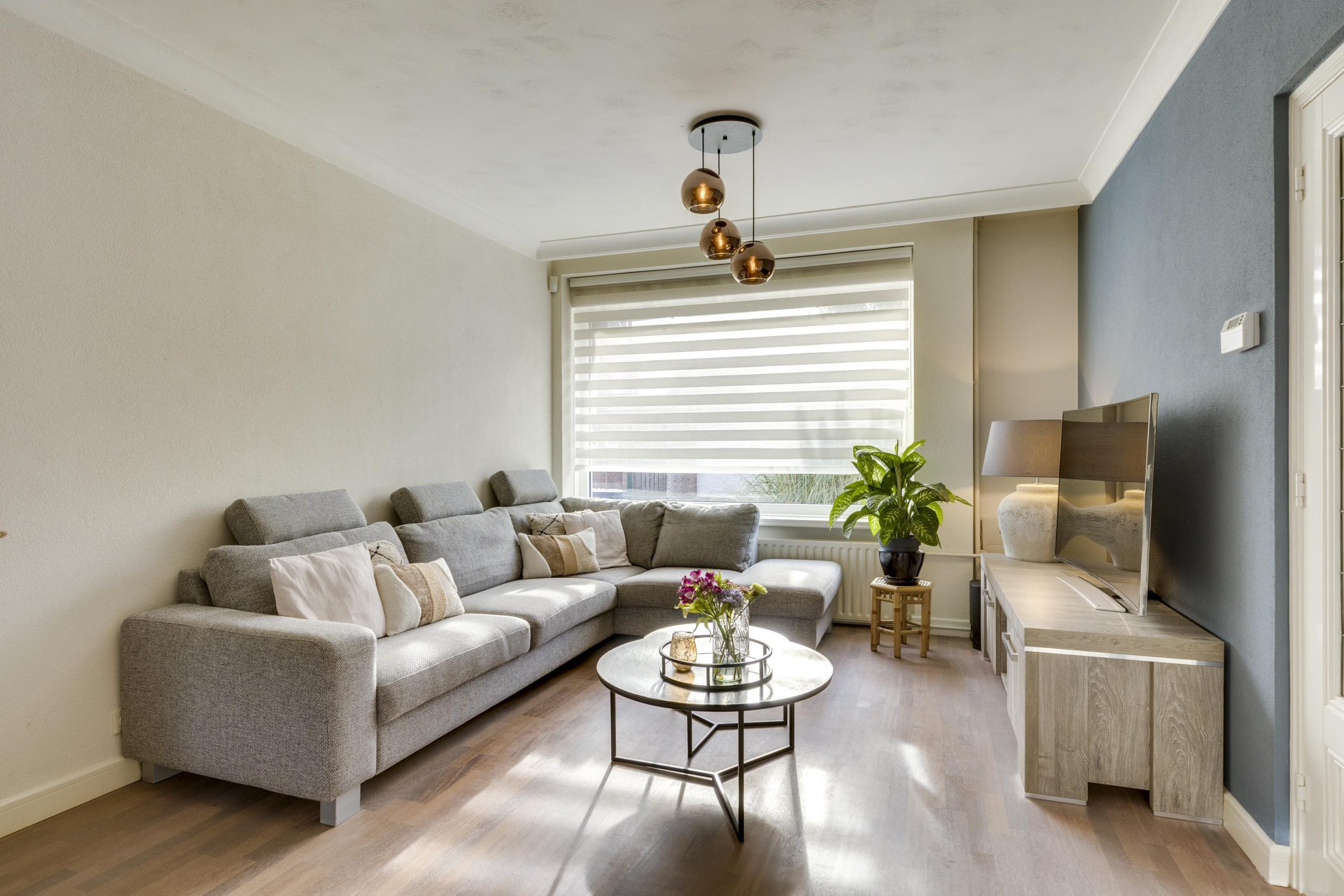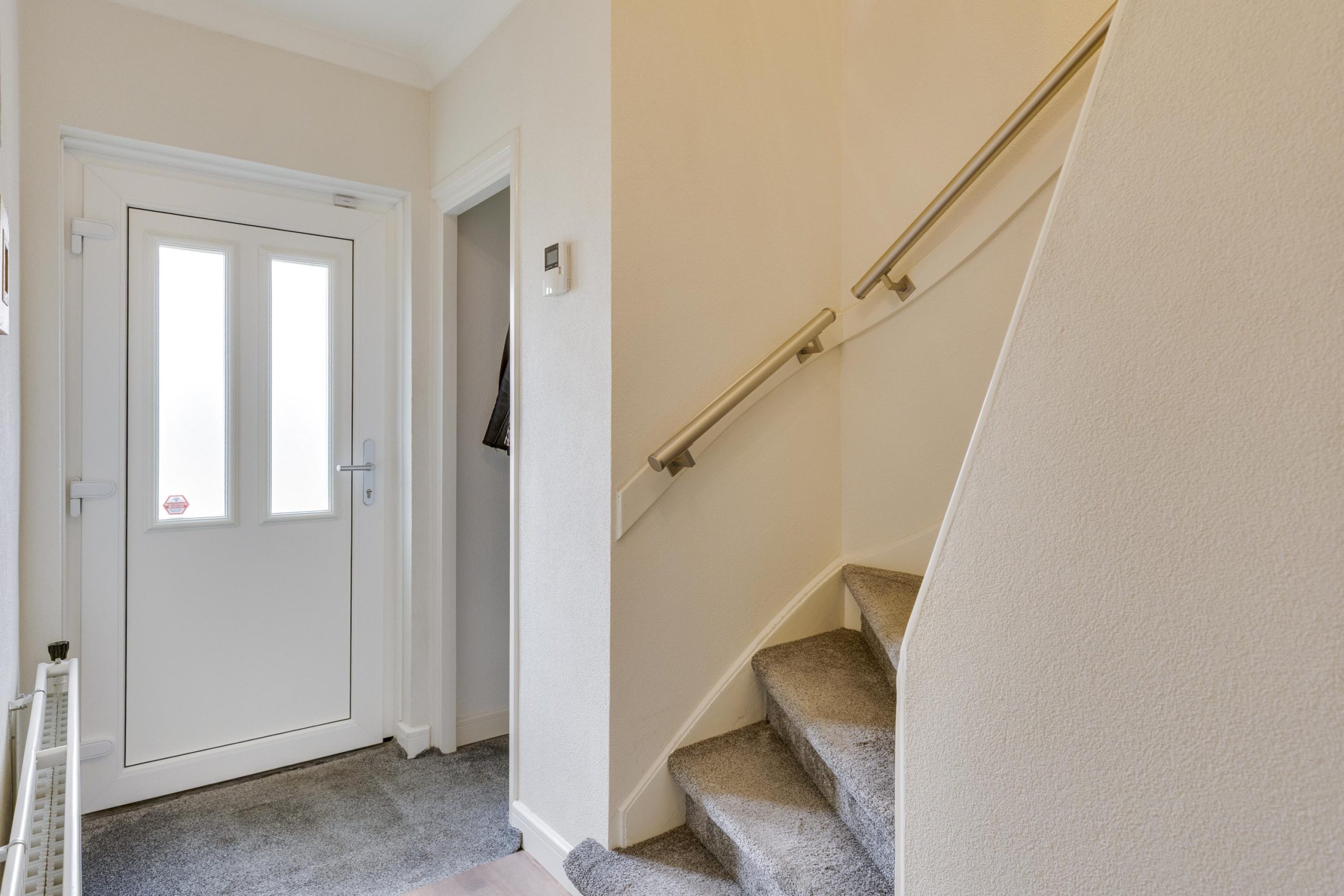 Via de kunststof voordeur met glas-inzet betreedt u een lichte, verzorgde hal met moderne afwerking en een warme parketvloer. Links bevindt zich een verdiepte garderobekast (voormalig toilet), en onder de trap een praktische bergkast met de moderne meterkast en slimme meters.