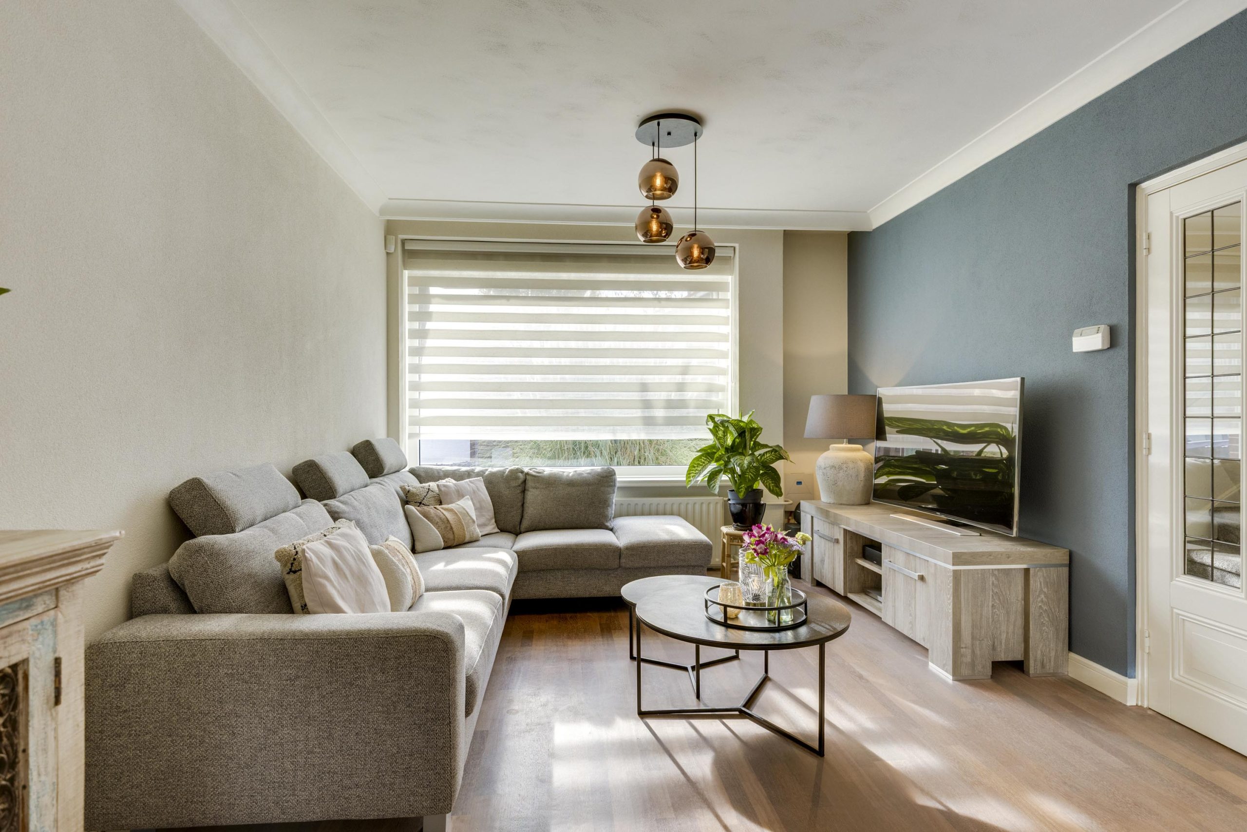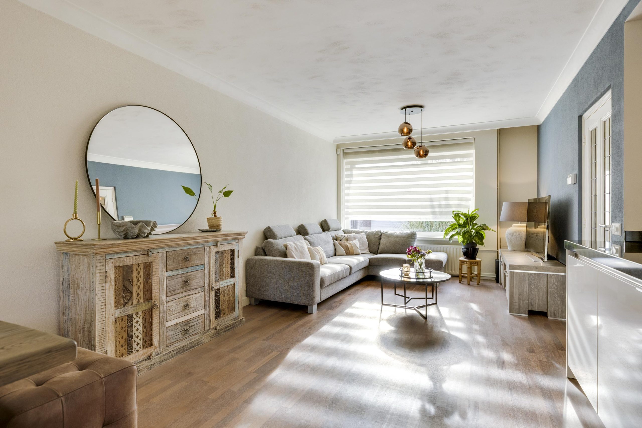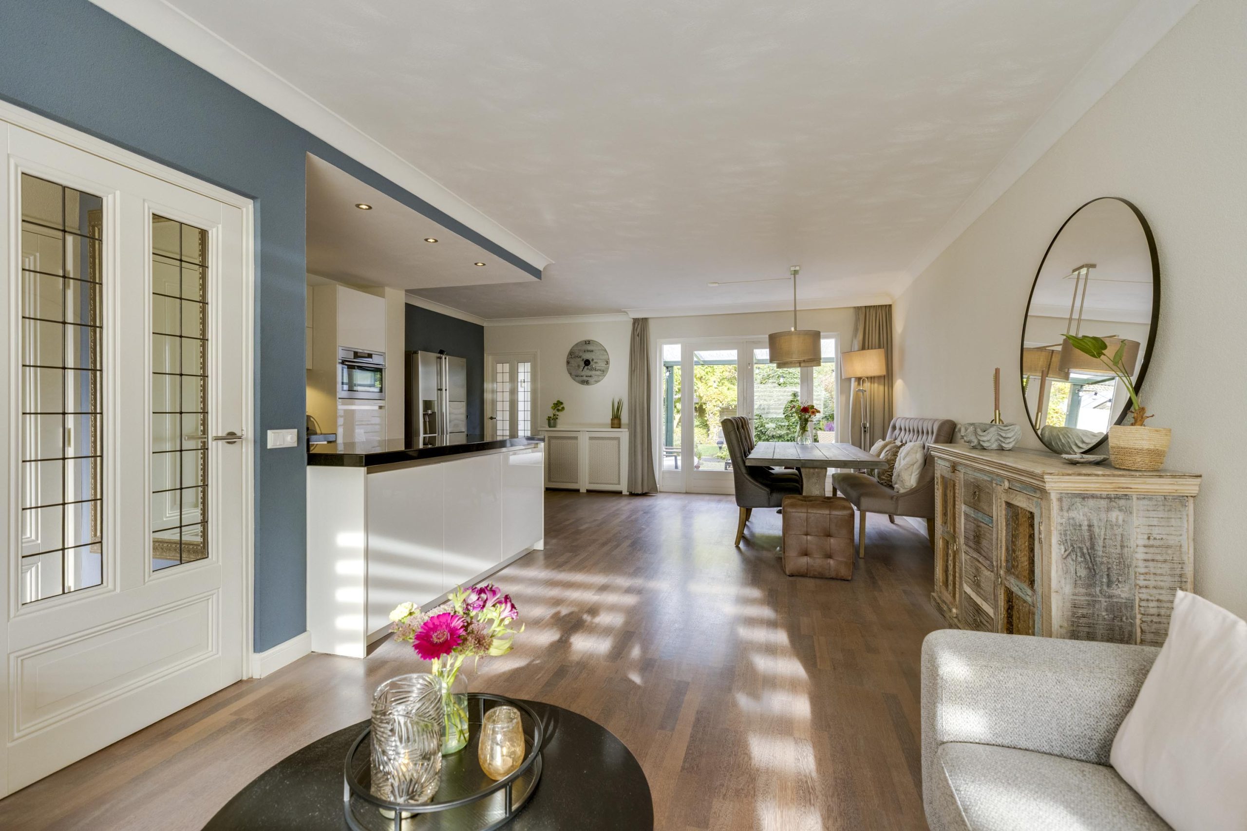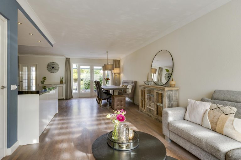 De sfeervolle living met exclusieve hardhouten parketvloer heeft een uitnodigende uitstraling. Vanuit hier kijkt u prachtig weg richting de brede groenstrook, een stukje verderop. Het plafond met sierlijsten geeft de ruimte een elegante en verzorgde afwerking. Aan de voorzijde zorgen een ingebouwd elektrisch rolluik en een markies voor comfort en privacy, terwijl aan de achterzijde de dubbel openslaande deuren toegang bieden tot de prachtige tuin en zorgen voor een prettig lichtinval.