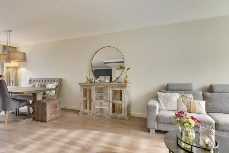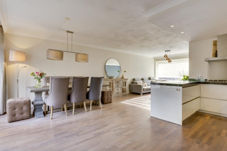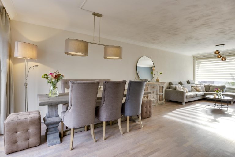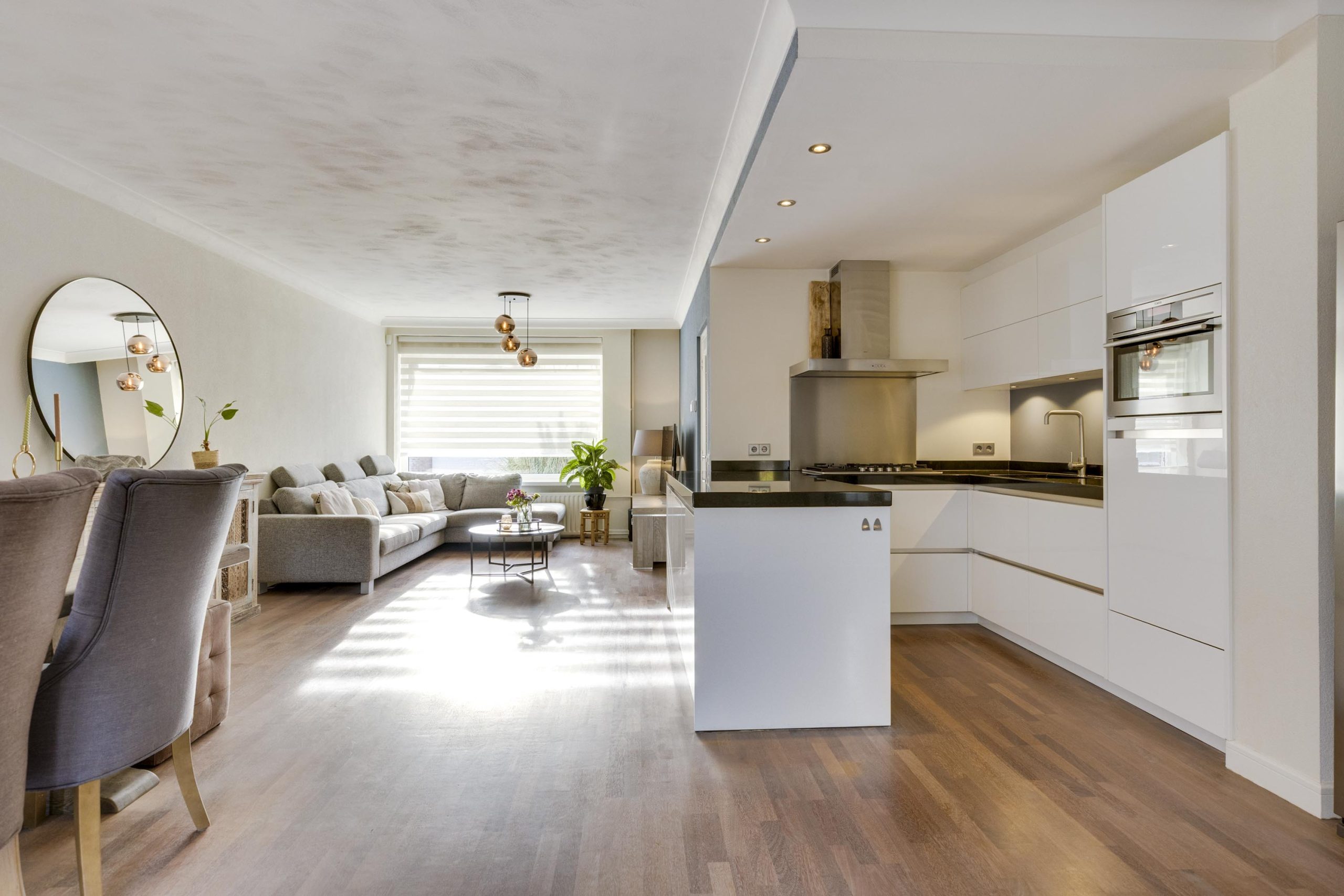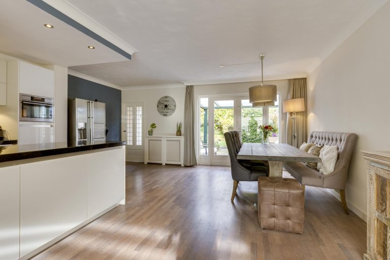De sfeervolle living met exclusieve hardhouten parketvloer heeft een uitnodigende uitstraling. Vanuit hier kijkt u prachtig weg richting de brede groenstrook, een stukje verderop. Het plafond met sierlijsten geeft de ruimte een elegante en verzorgde afwerking. Aan de voorzijde zorgen een ingebouwd elektrisch rolluik en een markies voor comfort en privacy, terwijl aan de achterzijde de dubbel openslaande deuren toegang bieden tot de prachtige tuin en zorgen voor een prettig lichtinval.