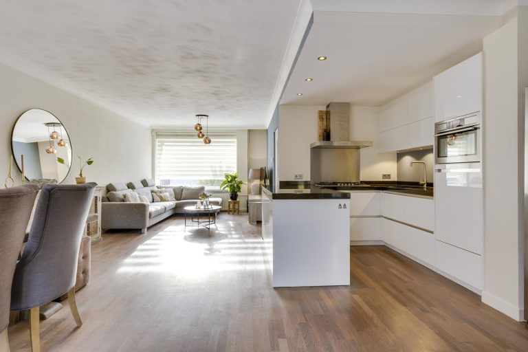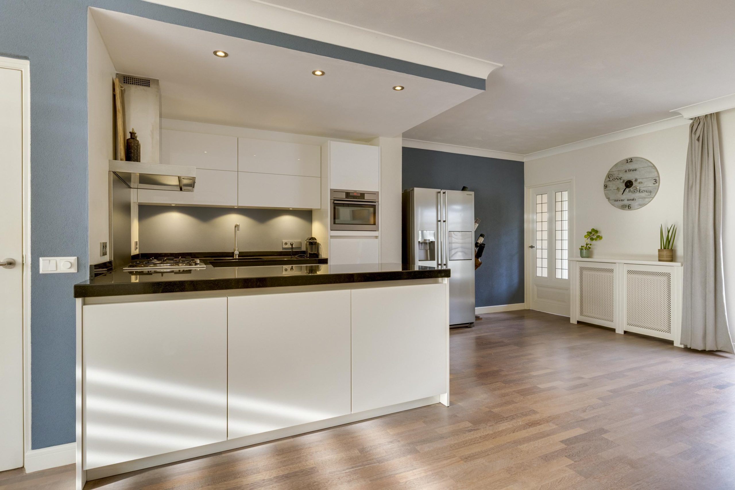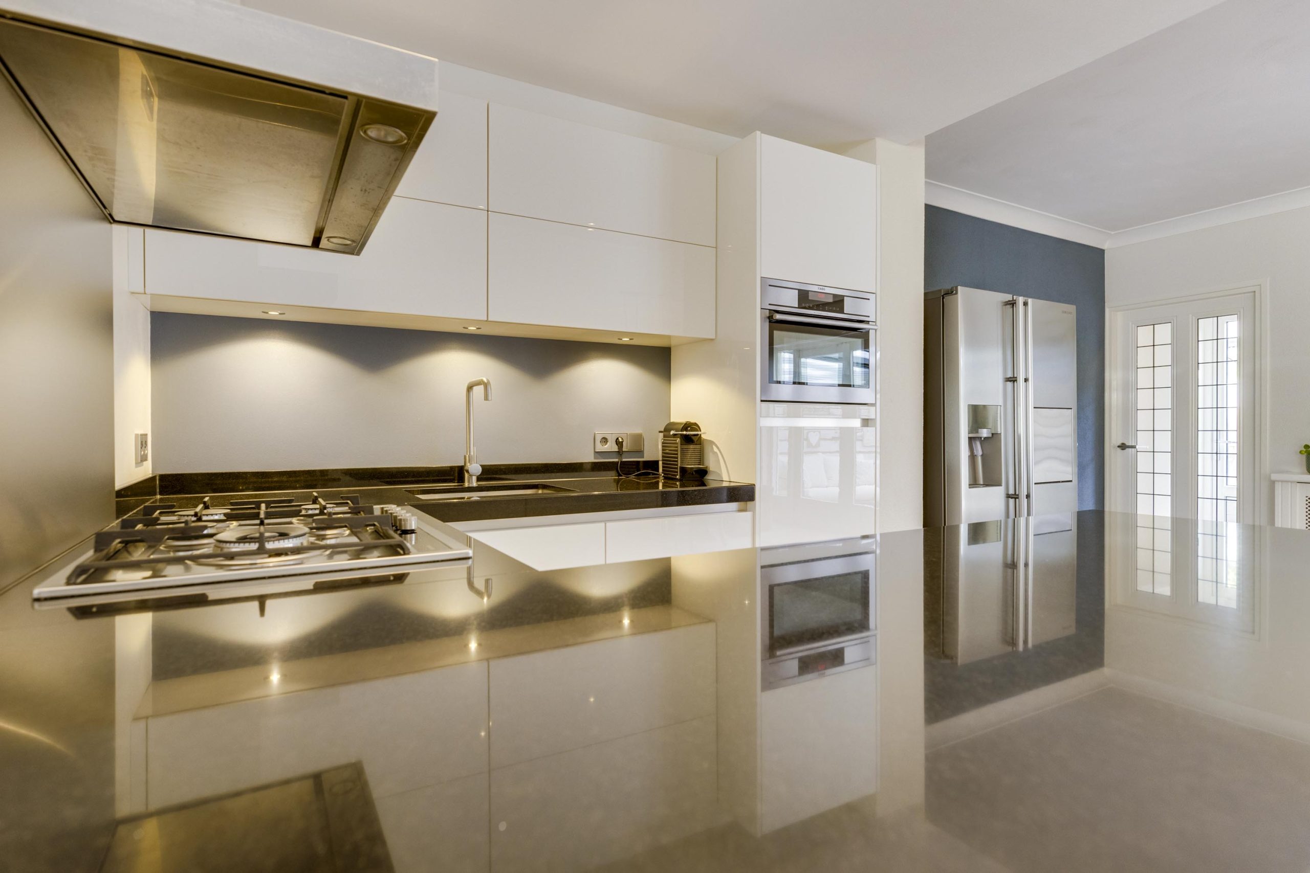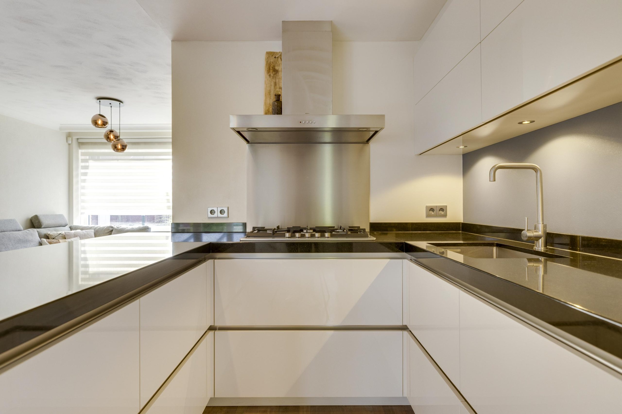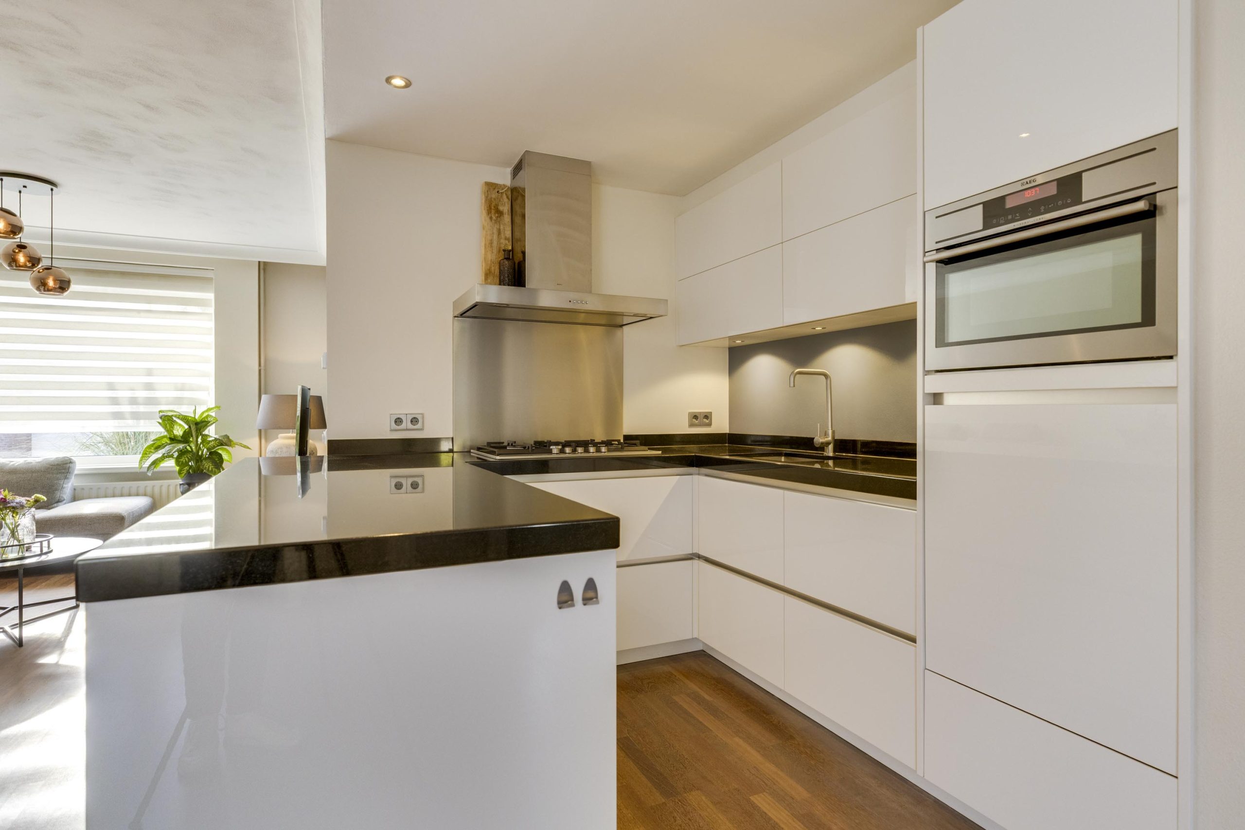 De open keuken in U-vorm is compleet uitgerust met een 5-pits gasfornuis, afzuigkap, vaatwasser op hoogte, combi-oven, Amerikaanse koelkast/vriezer en een gootsteen. Er is volop opbergruimte, ook aan de voorzijde van het keukeneiland. De keuken is afgewerkt met een donker natuursteen werkblad, hoogglans witte fronten en inbouwspots in het plafond, wat zorgt voor een luxe uitstraling. Kortom, een plek waar elke foodie zijn culinaire creativiteit de vrije loop laat.