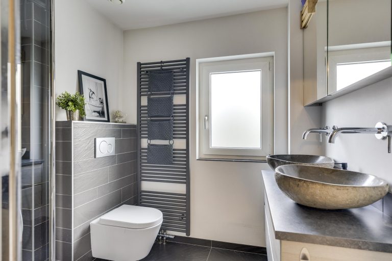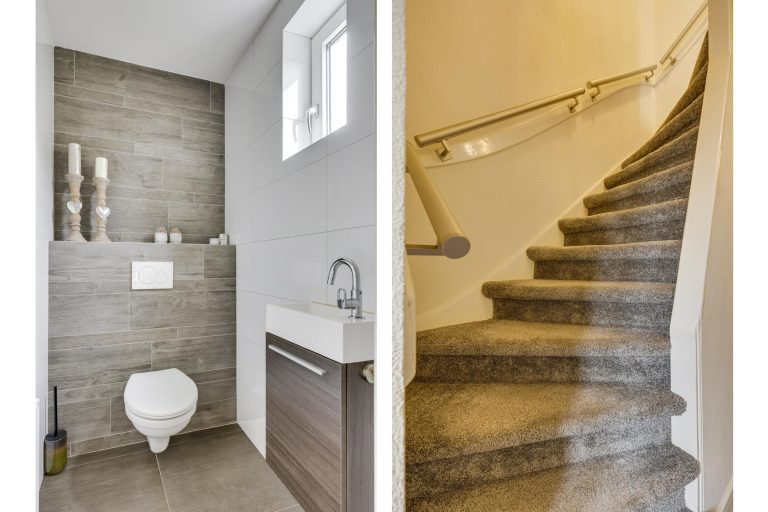 Het toilet, gelegen achterin de woning, is volledig betegeld in een moderne, tijdloze stijl. De ruimte is voorzien van vloerverwarming, een wandcloset, fontein en een raam voor natuurlijke ventilatie.