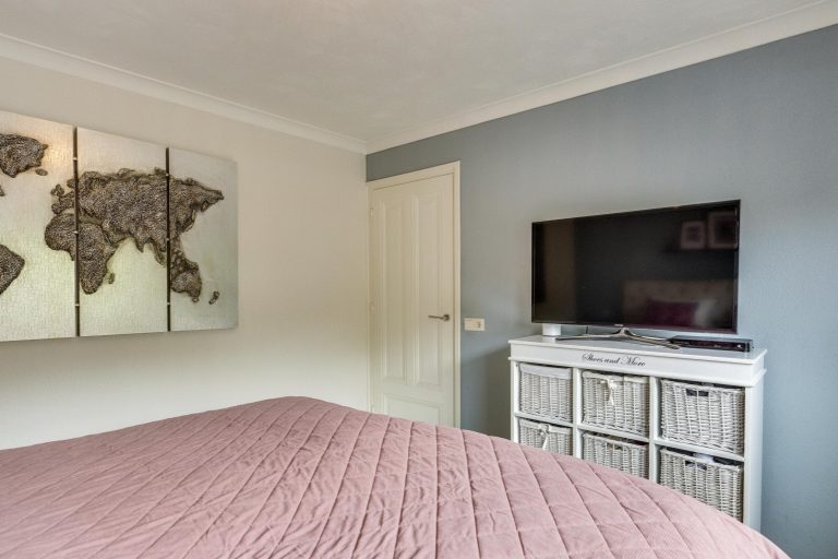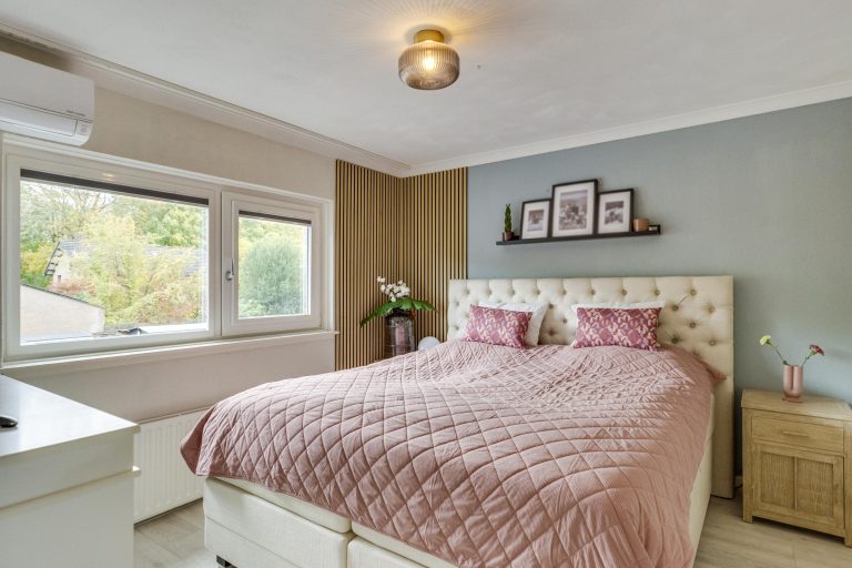 Op de eerste verdieping vindt u twee ruime slaapkamers, de badkamer en een praktische wasruimte (de voormalige badkamer). De gehele verdieping is voorzien van een laminaat-vloer. De hoofdslaapkamer, gelegen aan de achterzijde van de woning, is ruim van opzet en biedt een prachtig uitzicht op de achtertuin. Dankzij de grote raampartijen met Safe & Go-functie is er veel natuurlijke lichtinval. De ruimte is voorzien van plafondlijsten en een airco-installatie (2023) die zowel koelt als verwarmt, voor optimaal comfort het hele jaar door. De tweede slaapkamer aan de voorzijde is eveneens licht en sfeervol, met grote ramen voorzien van Safe & Go-functie. Ook deze kamer heeft plafondlijsten en is daarmee in dezelfde verzorgde stijl afgewerkt.