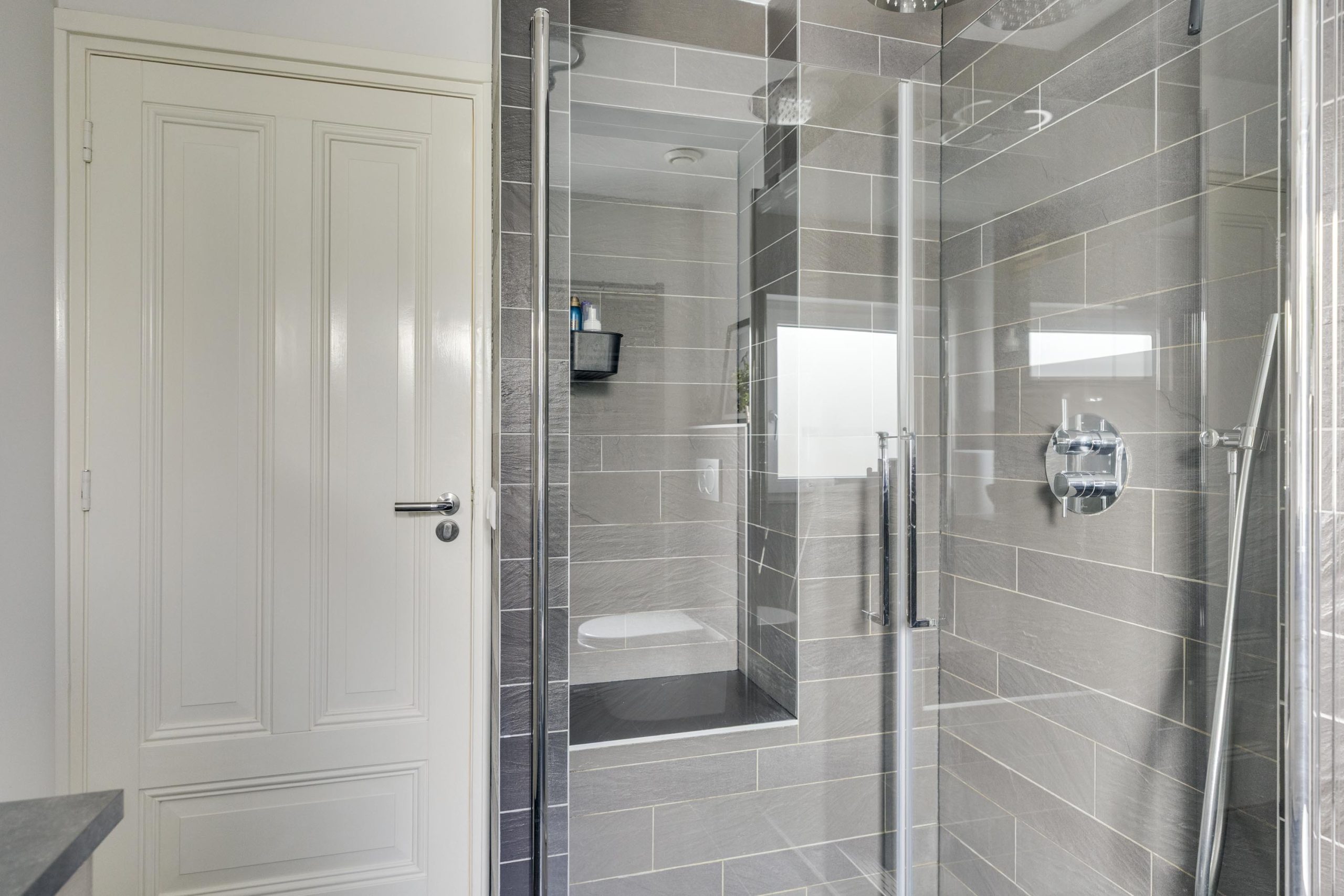 De moderne badkamer is in 2015 vernieuwd en voorzien van vloerverwarming voor extra comfort. De ruimte voldoet aan alle wensen: met een dubbele wastafel met meubel, een wandcloset en een ruime inloopdouche met inklapbare glazen wanden, waardoor de kamer optimaal benut wordt. Verder is er een designradiator aanwezig en een draaikiepraam dat zorgt voor natuurlijke ventilatie en daglicht. De combinatie van warme en moderne materialen geeft de badkamer een stijlvolle en luxe uitstraling.