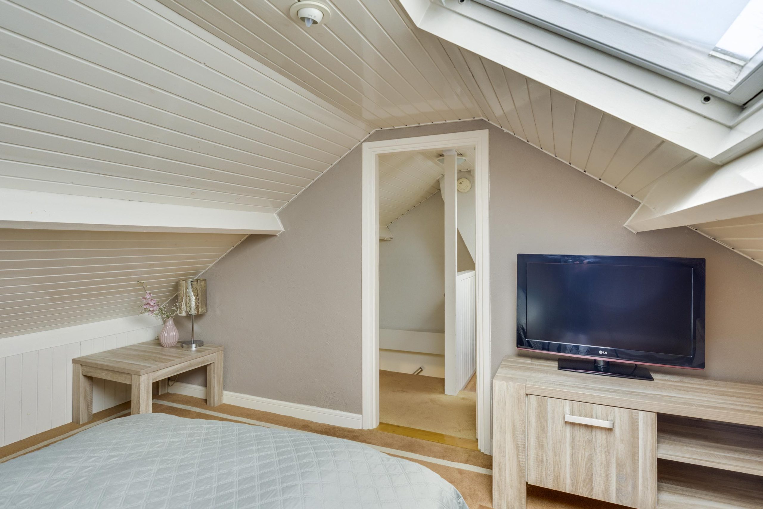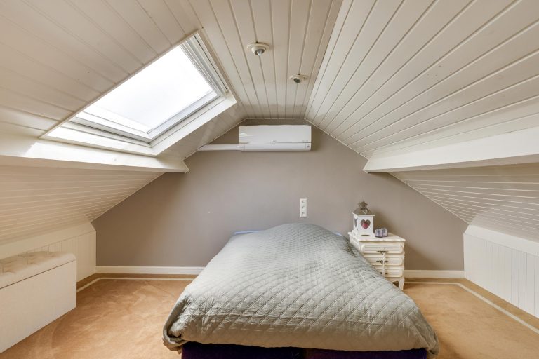 Via een vaste trap bereikt u de verrassend ruime tweede verdieping. Op de voorzolder bevindt zich aan de linkerkant de cv-ketel en aan de rechterzijde een ruime opbergkast. Dankzij het dakraam is deze ruimte prettig licht en goed geventileerd. De slaapkamer op deze verdieping is sfeervol afgewerkt met een houten dakbeschot en beschikt over een groot dakraam, wat zorgt voor veel daglicht. De airco-installatie (2023) op deze verdieping kan zowel verwarmen als koelen, waardoor de kamer het hele jaar door comfortabel aanvoelt.