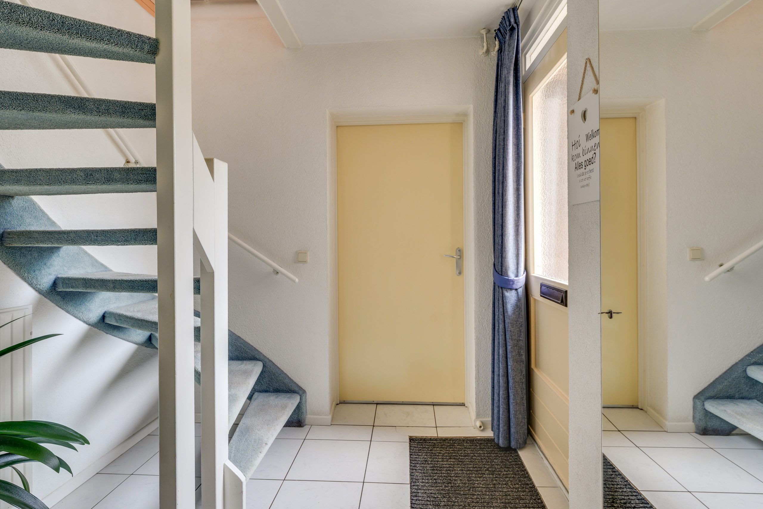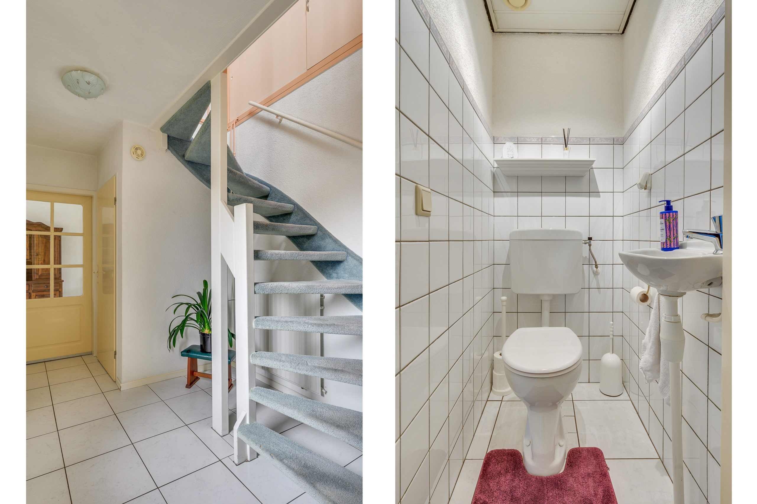 Via de voordeur komt u in de hal met een lichte tegelvloer. In de hal bevindt zich aan de rechterzijde de deur naar de aanpandige garage. Daarnaast is hier het gastentoilet en de meterkast gesitueerd, voorzien van een slimme meter. Het toilet is grotendeels betegeld en uitgerust met een staand closet, fontein en mechanische ventilatie.