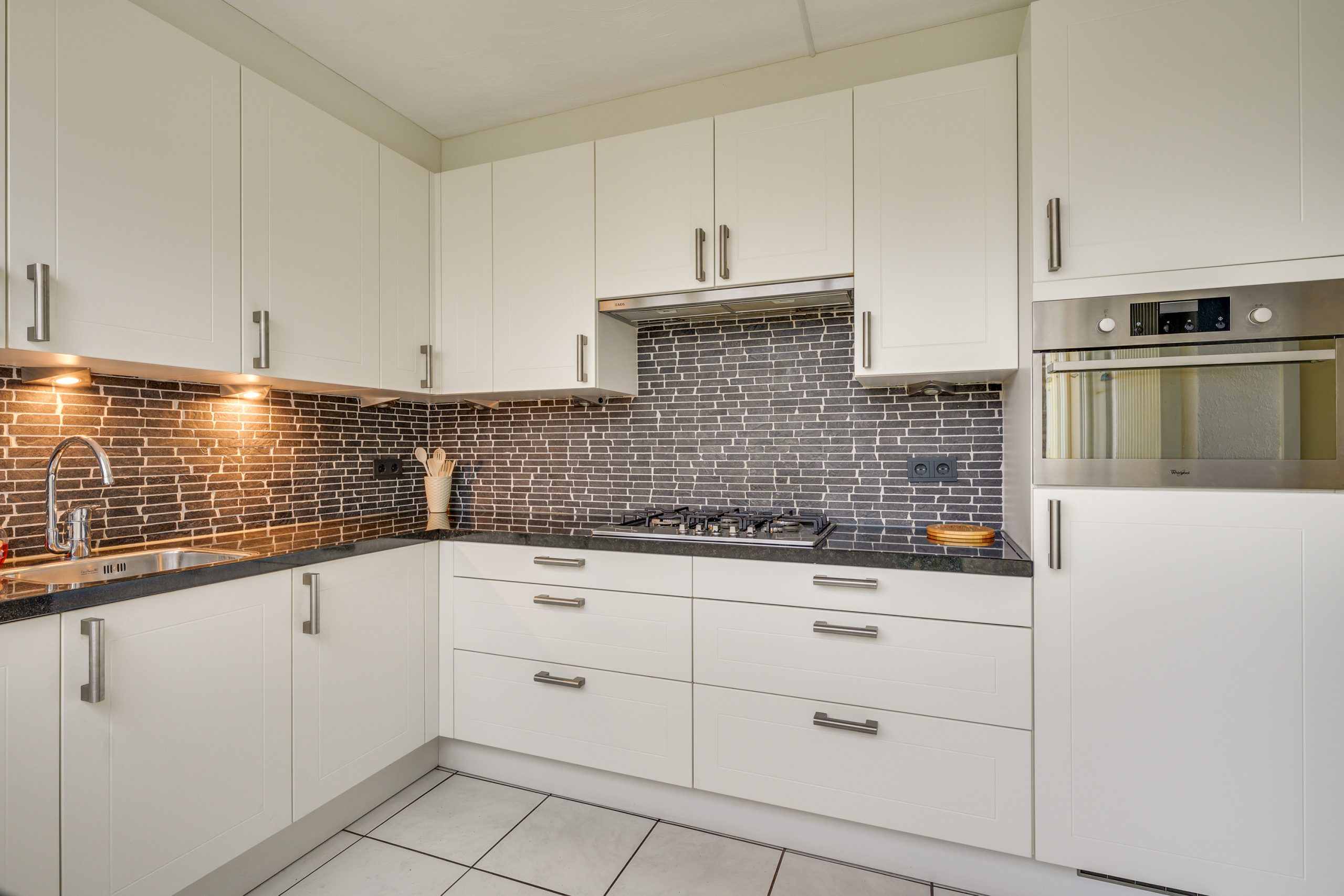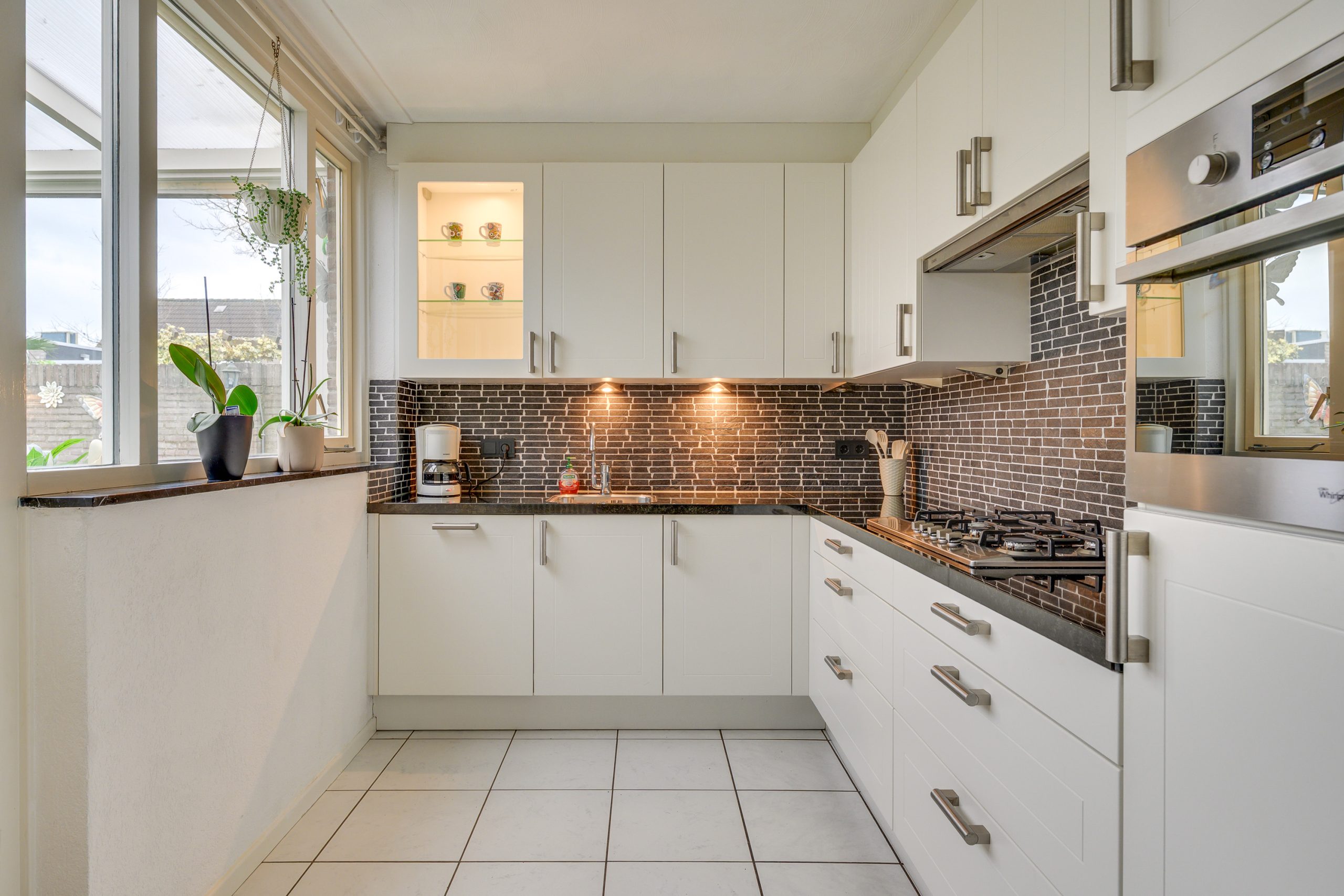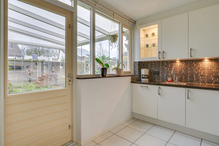 De open keuken staat in directe verbinding met de living en is uitgevoerd met een lichte tegelvloer. De ruimte is erg licht door meerdere raampartijen. De keuken is geplaatst in 2018 en beschikt over een granieten werkblad en complete inbouwapparatuur, waaronder een combi-oven, vaatwasser, koelkast, een 5-pits gasfornuis met afzuigkap en een spoelbak. Via de tuindeur is er directe toegang tot de serre.