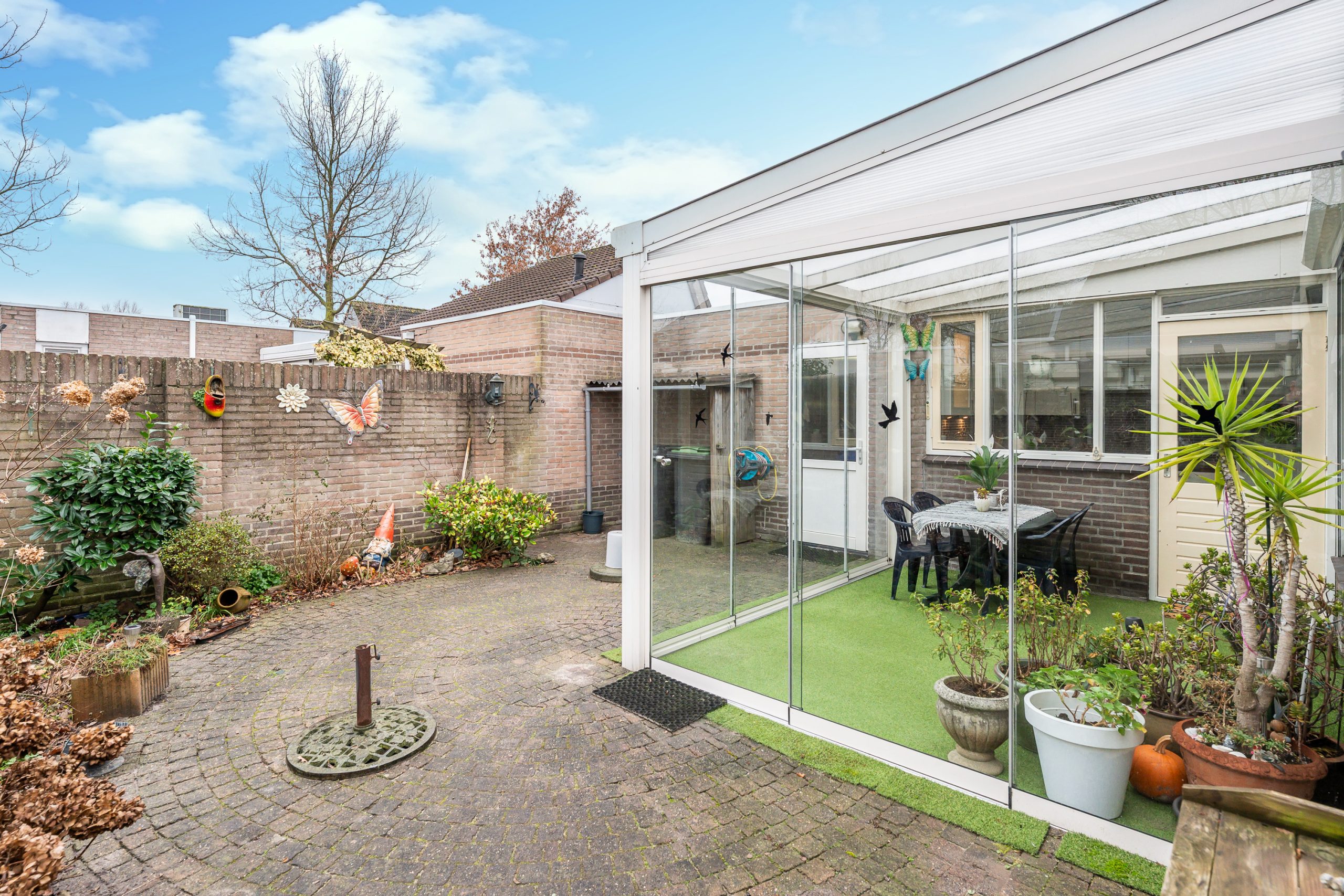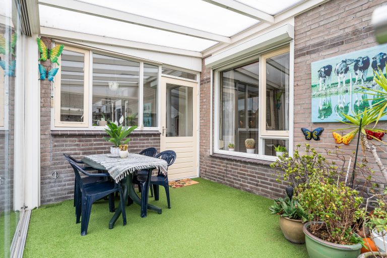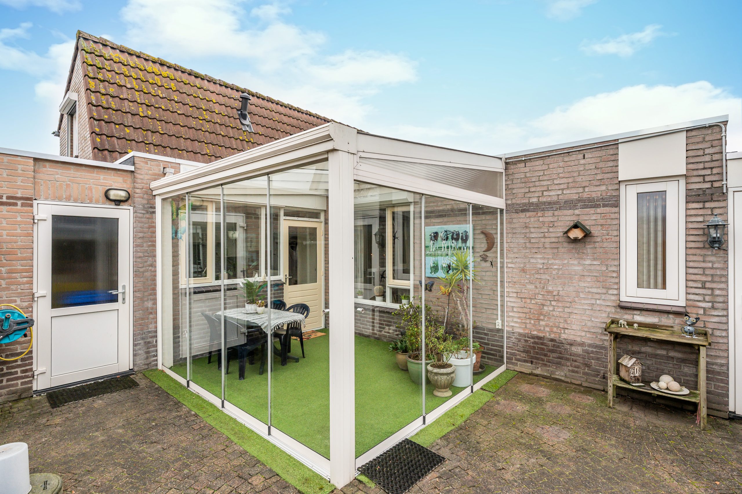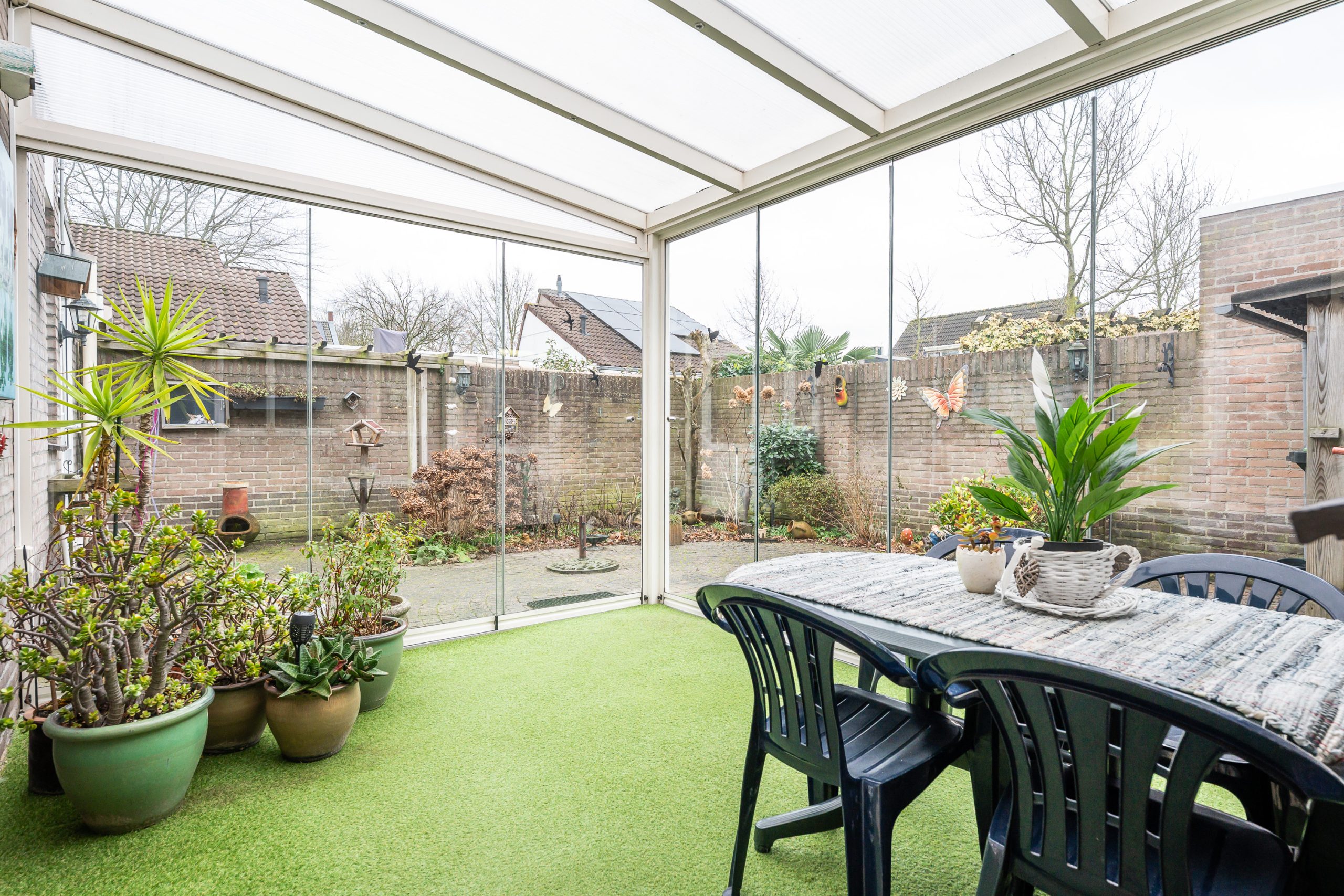 De serre, geplaatst in 2018, vormt een waardevolle uitbreiding van de leefruimte. De serre is uitgevoerd met kunstgras en voorzien van twee schuifpuien, waardoor u eenvoudig kunt variëren tussen open en beschut zitten.