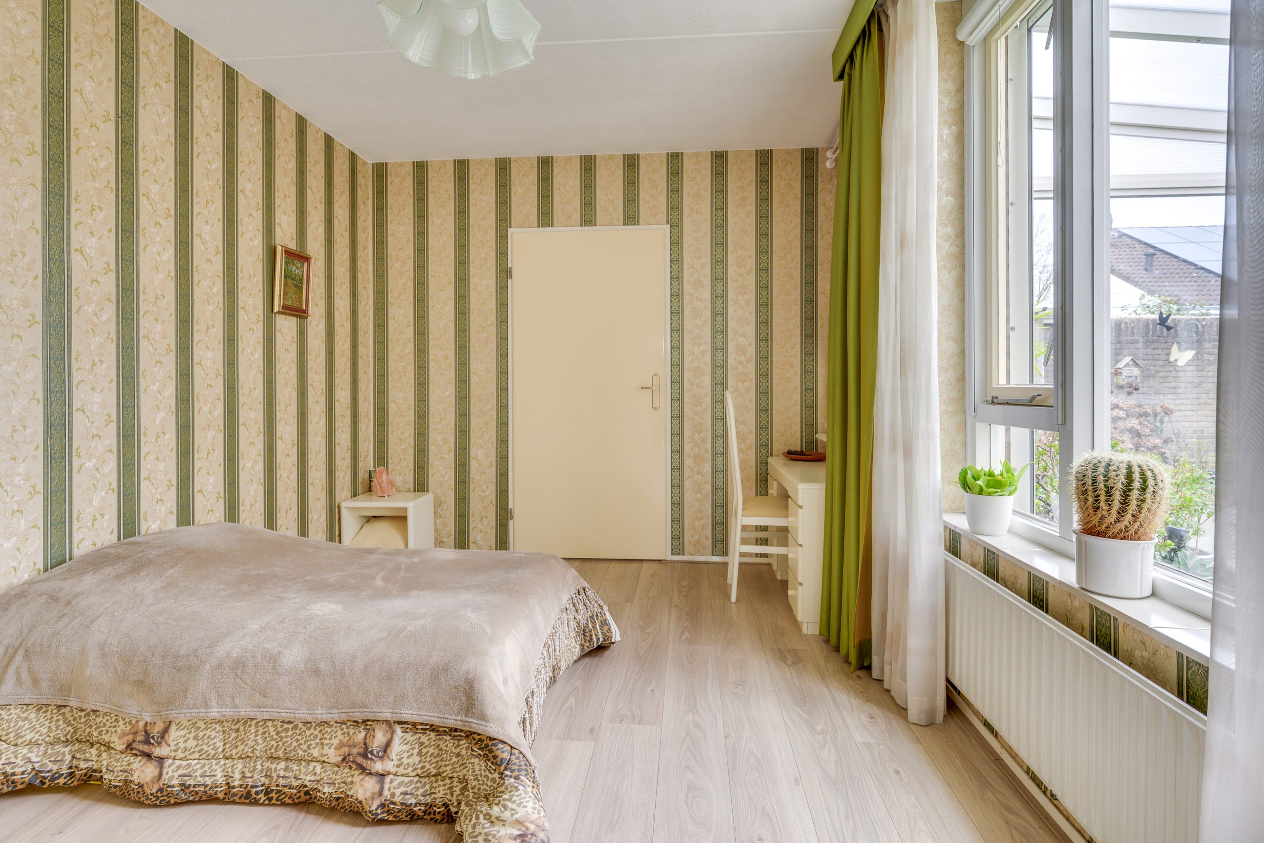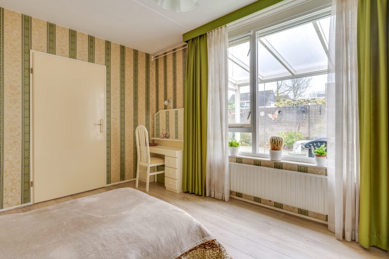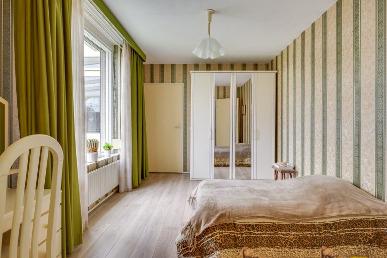 Op de begane grond bevindt zich een ruime slaapkamer met een nette laminaatvloer en wanden met behang, wat zorgt voor een comfortabele uitstraling. Het grote raam is voorzien van een rolluik, waardoor lichtinval en privacy eenvoudig naar wens te regelen zijn. De slaapkamer beschikt over een directe verbinding met de ensuite badkamer.