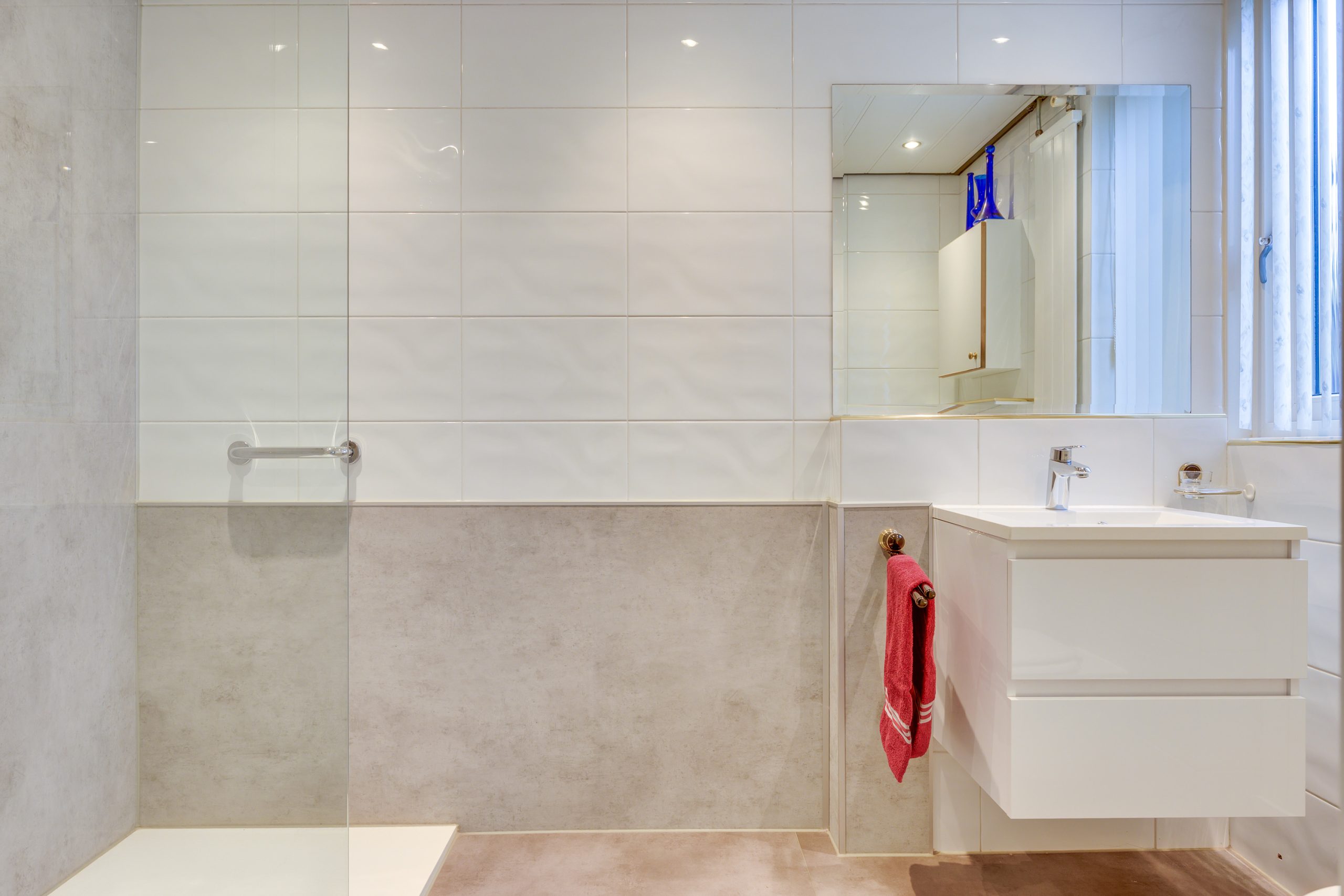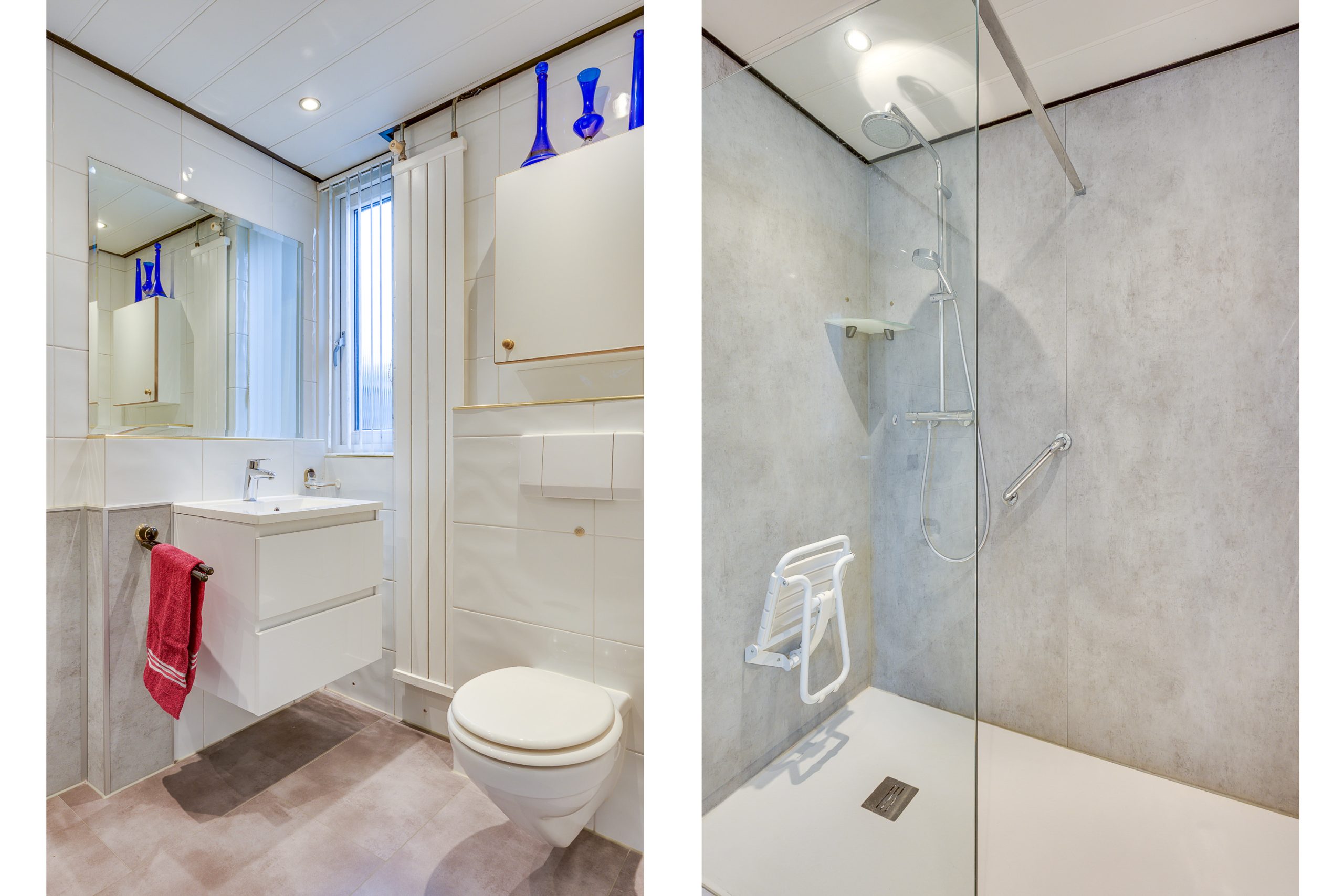 De ensuite badkamer is in 2023 vernieuwd en uitgevoerd in een moderne, tijdloze stijl. De ruimte is volledig betegeld en voorzien van een fraaie grijze tegelvloer. De badkamer beschikt over een ruime inloopdouche, een wastafel met meubel, een wandcloset en een designradiator. Daarnaast zorgen een draaikiepraam, mechanische ventilatie en inbouwspots voor comfort, ventilatie en een aangename sfeer.