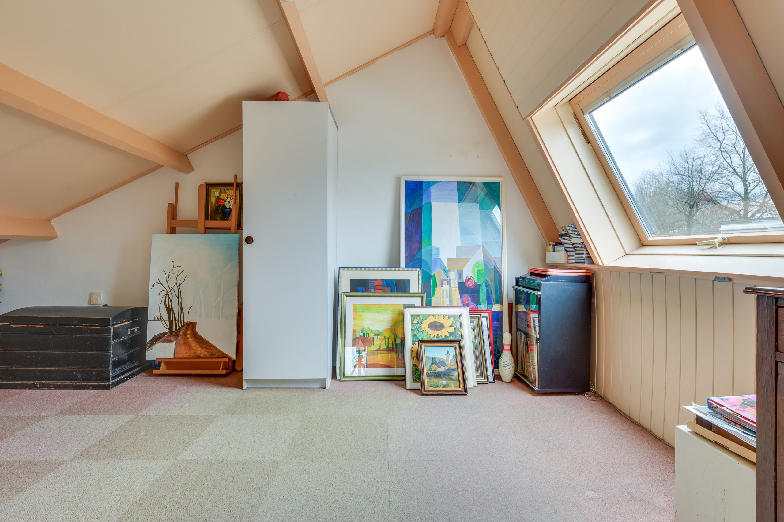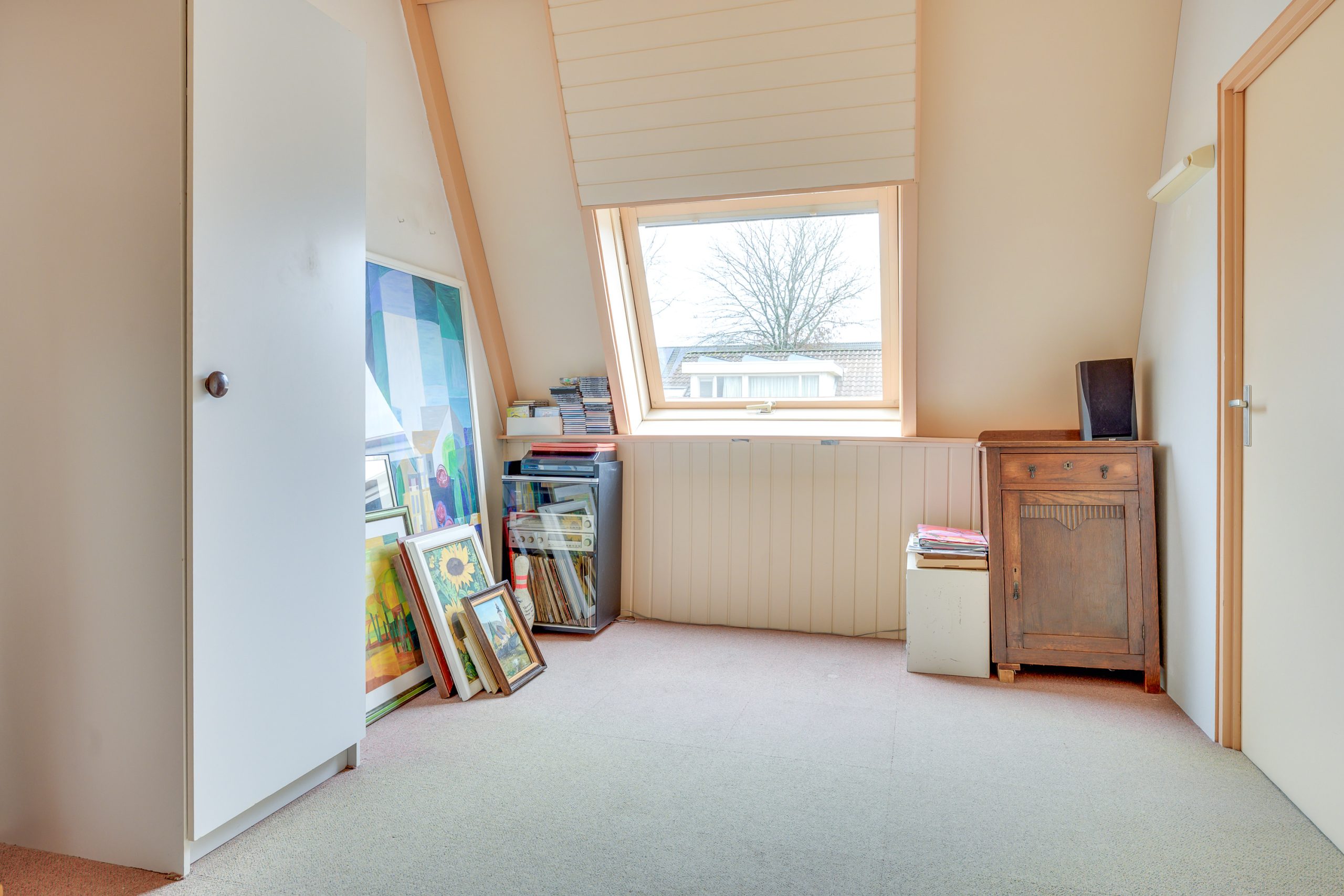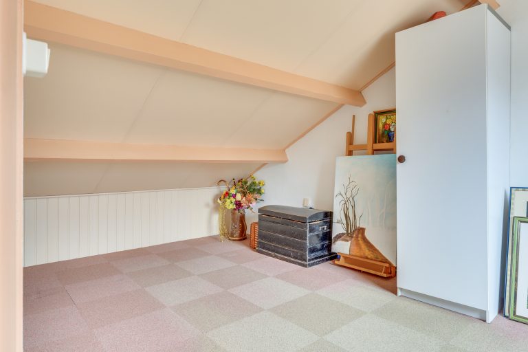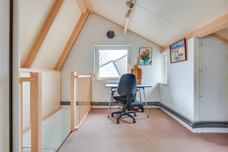 Ook bevindt zich hier een grote, multifunctionele slaapkamer met aangenaam lichtinval dankzij het grote kantelraam. De ruimte leent zich voor het realiseren van twee kamers. Met het plaatsen van een dakkapel kan bovendien eenvoudig extra leefruimte worden gecreëerd.