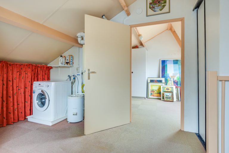 De ruime voorzolder biedt plaats voor de cv-installatie en beschikt over aansluitingen voor wasmachine en droger. Daarnaast is er een inbouwkast aanwezig voor extra bergruimte. De ruimte wordt prettig verlicht door een draaikiepraam met kunststof kozijn en rolluik.