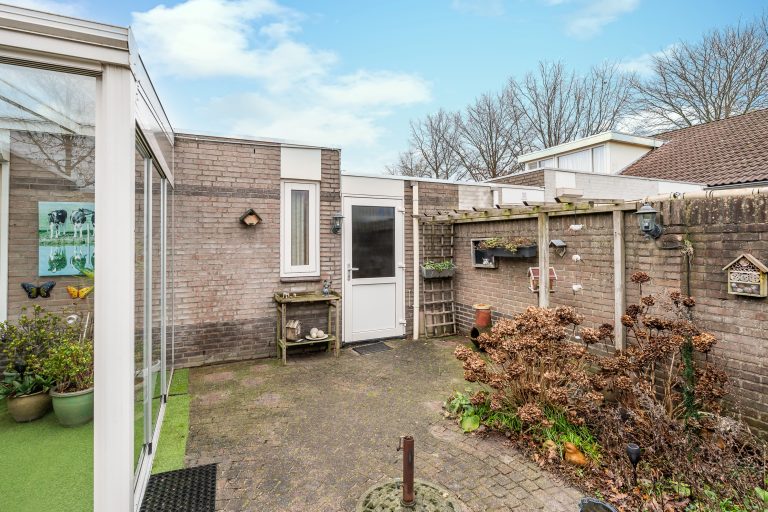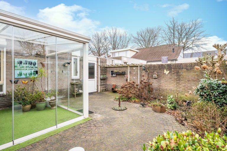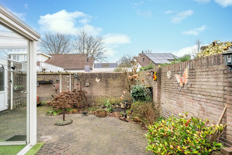 De onderhoudsvriendelijke patiotuin is gelegen op het oosten en biedt een fijne plek om in alle rust van de ochtendzon te genieten. De tuin is grotendeels bestraat en overzichtelijk aangelegd, met rondom een bordes met diverse beplanting, waaronder hortensia’s, wat in het voorjaar zorgt voor een groene en sfeervolle uitstraling. Achterin de tuin, aan de linkerzijde, bevindt zich een aangebouwde berging met elektra en een kunststof deur, ideaal voor opslag. Aan de voorzijde van de tuin is een kleine overkapping gerealiseerd voor de containers. Tevens bevindt zich hier een buitenkraan en een deur met directe toegang tot de garage.