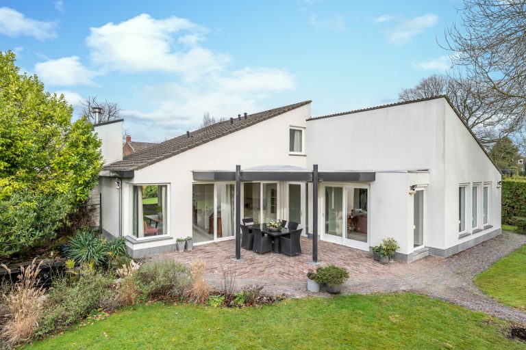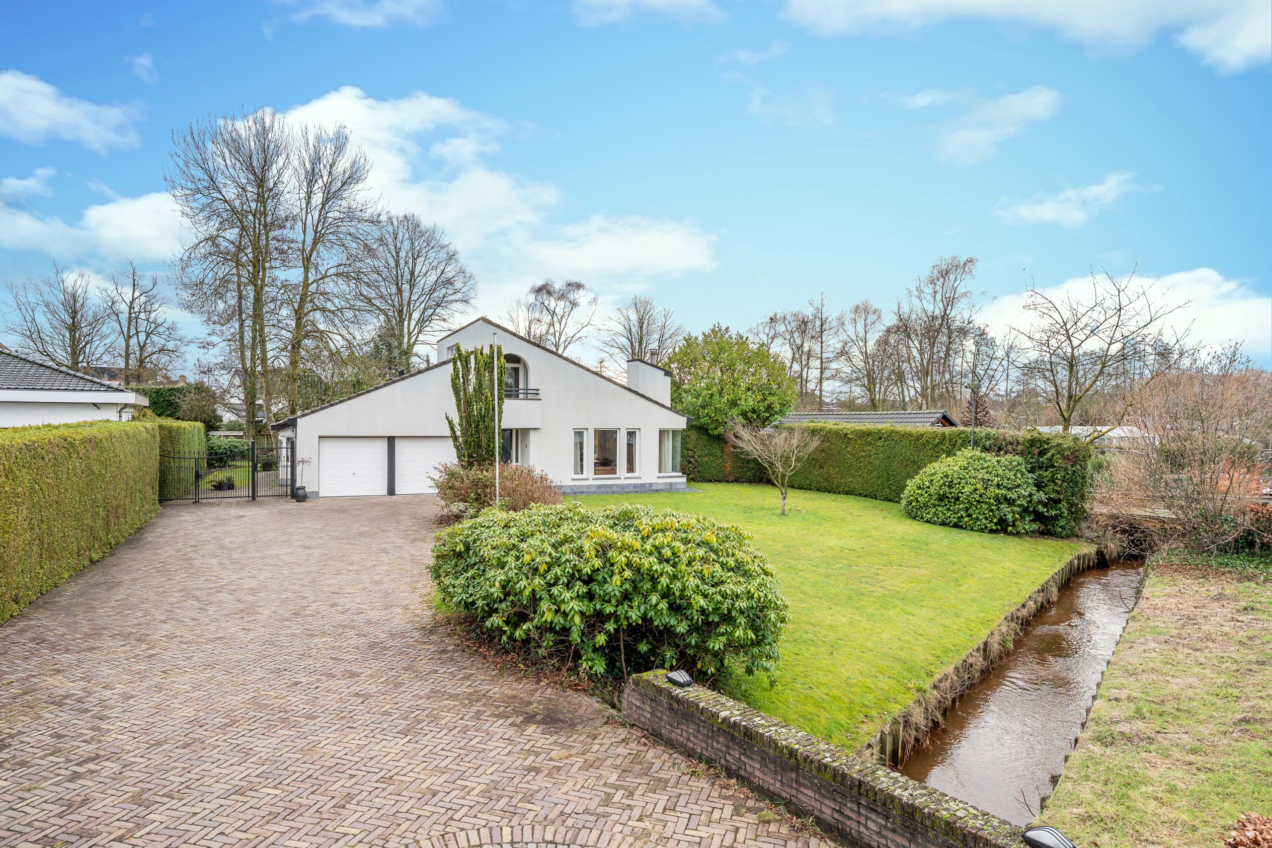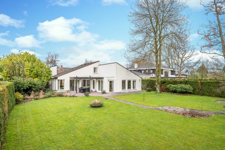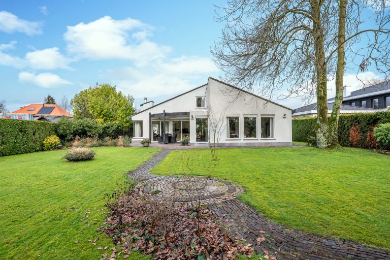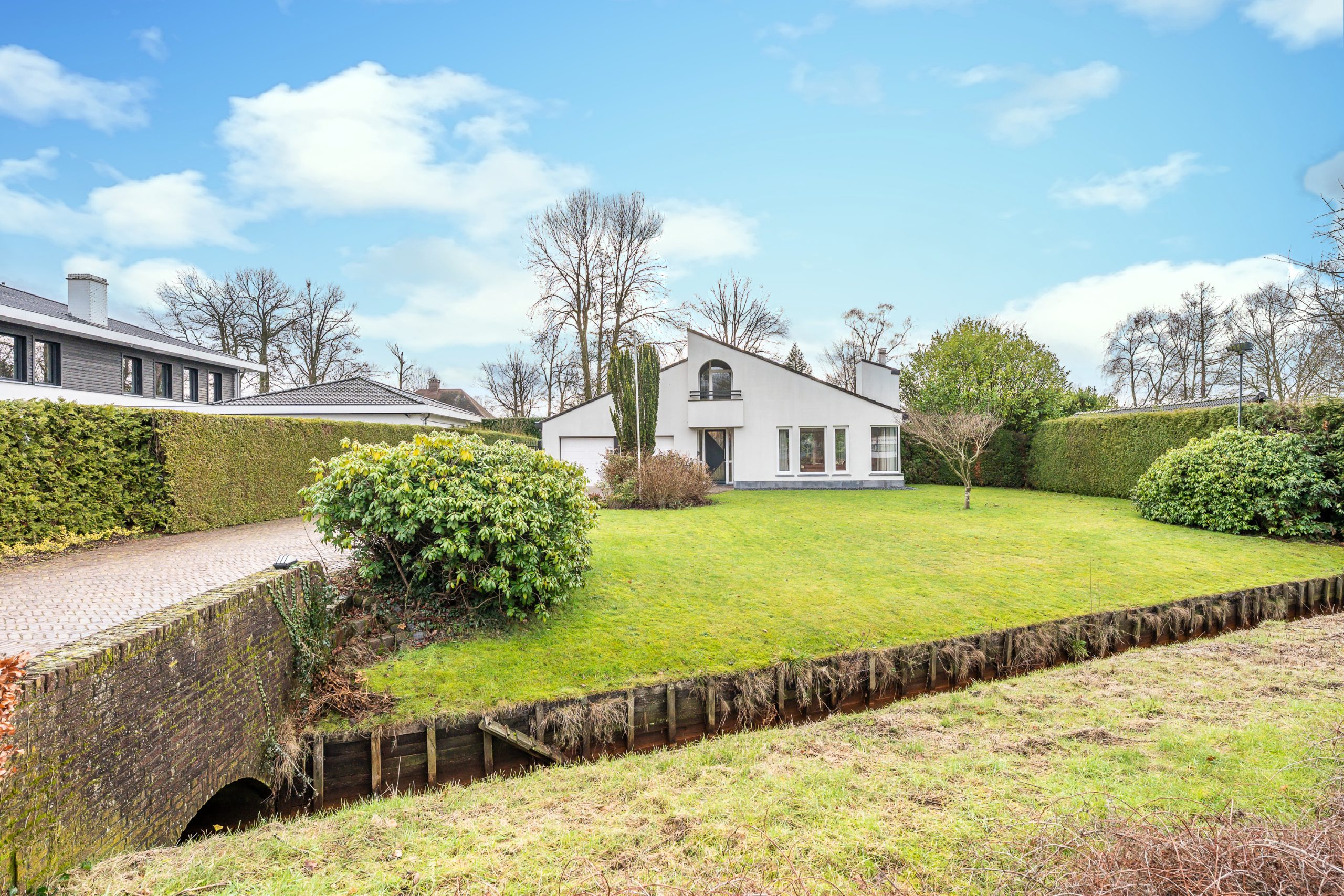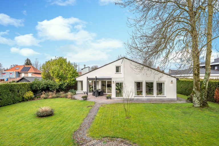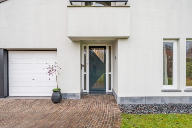 De voortuin verwelkomt u met een gevoel van rust en klasse. De royale oprit leidt via verzorgd groen naar de villa met inpandige dubbele garage, omgeven door volwassen hagen die privacy en geborgenheid bieden. Het strak gemaaide gazon en de natuurlijke waterloop (de Gender) langs het perceel, zorgen voor een bijna parkachtige sfeer. De architectuur van de villa springt direct in het oog: een unieke en eigenzinnige bouwvorm met speelse daklijnen en een krachtige, eigentijdse uitstraling.
