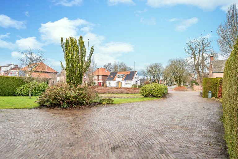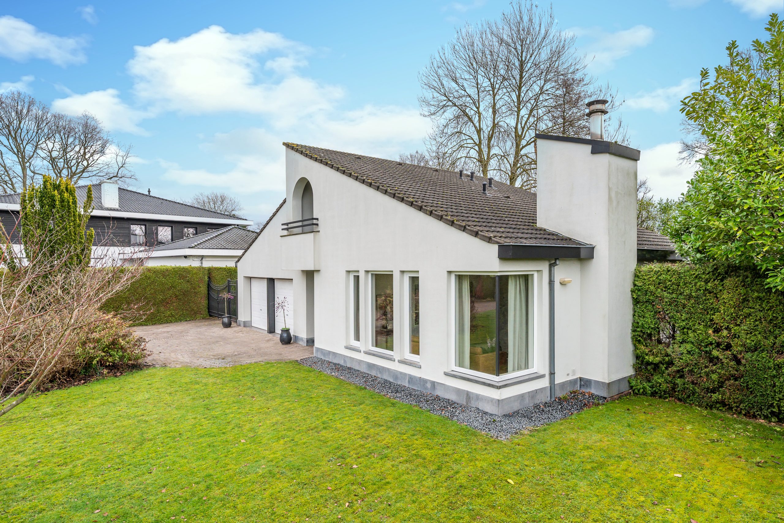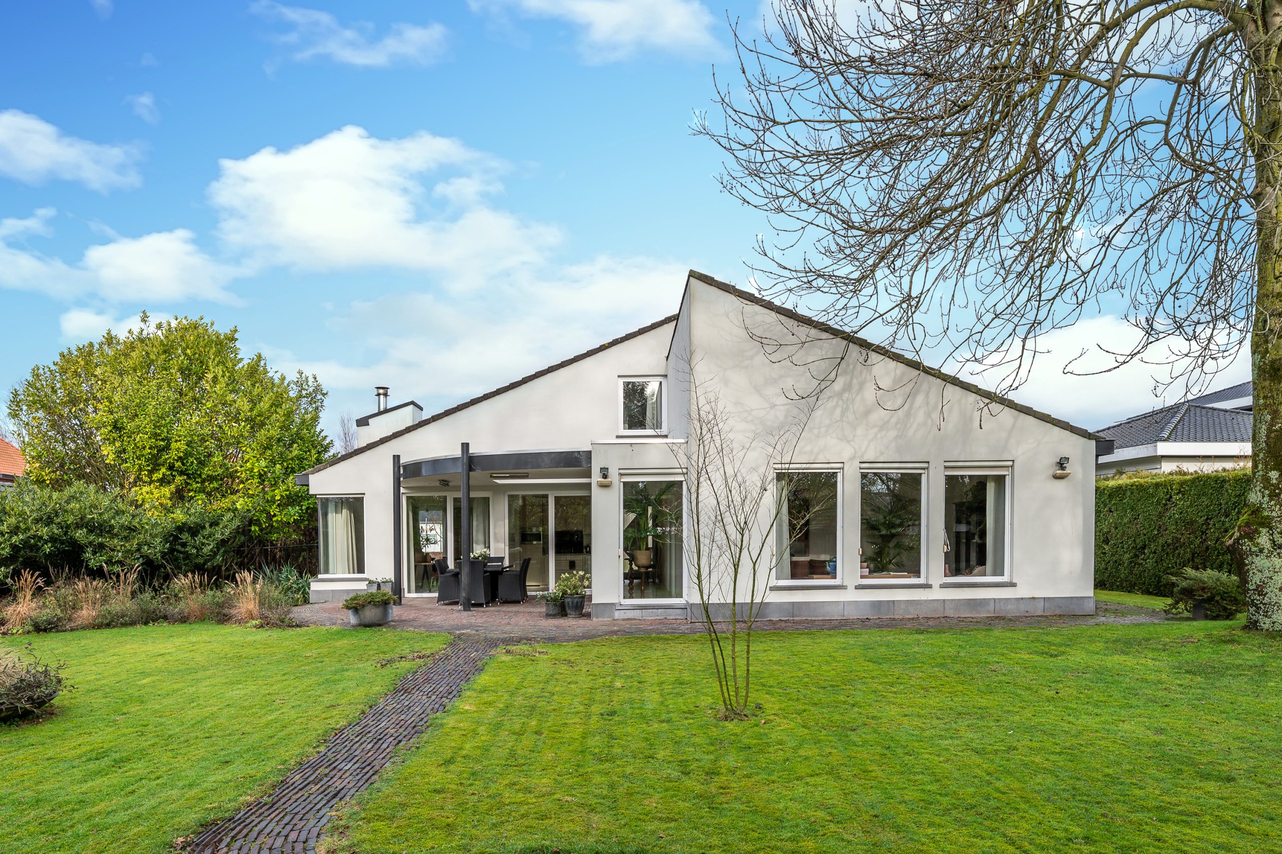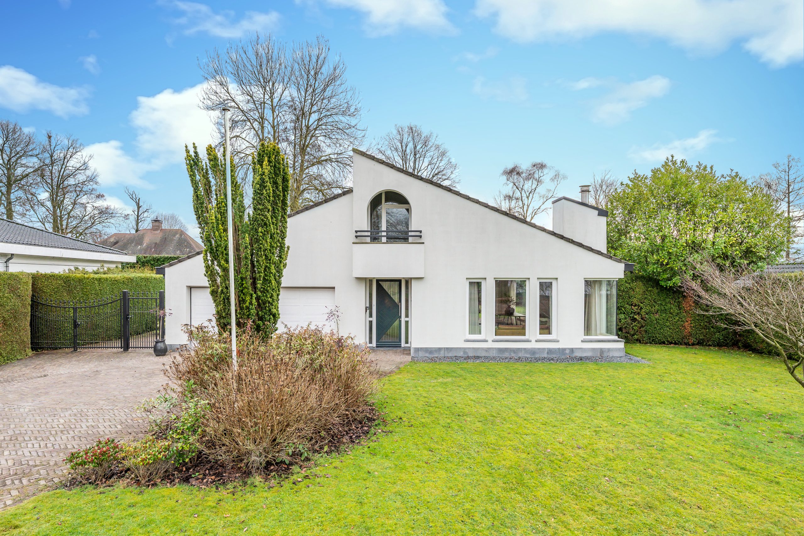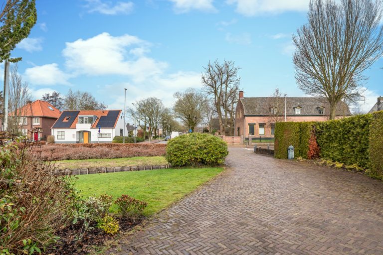 De voortuin verwelkomt u met een gevoel van rust en klasse. De royale oprit leidt via verzorgd groen naar de villa met inpandige dubbele garage, omgeven door volwassen hagen die privacy en geborgenheid bieden. Het strak gemaaide gazon en de natuurlijke waterloop (de Gender) langs het perceel, zorgen voor een bijna parkachtige sfeer. De architectuur van de villa springt direct in het oog: een unieke en eigenzinnige bouwvorm met speelse daklijnen en een krachtige, eigentijdse uitstraling.