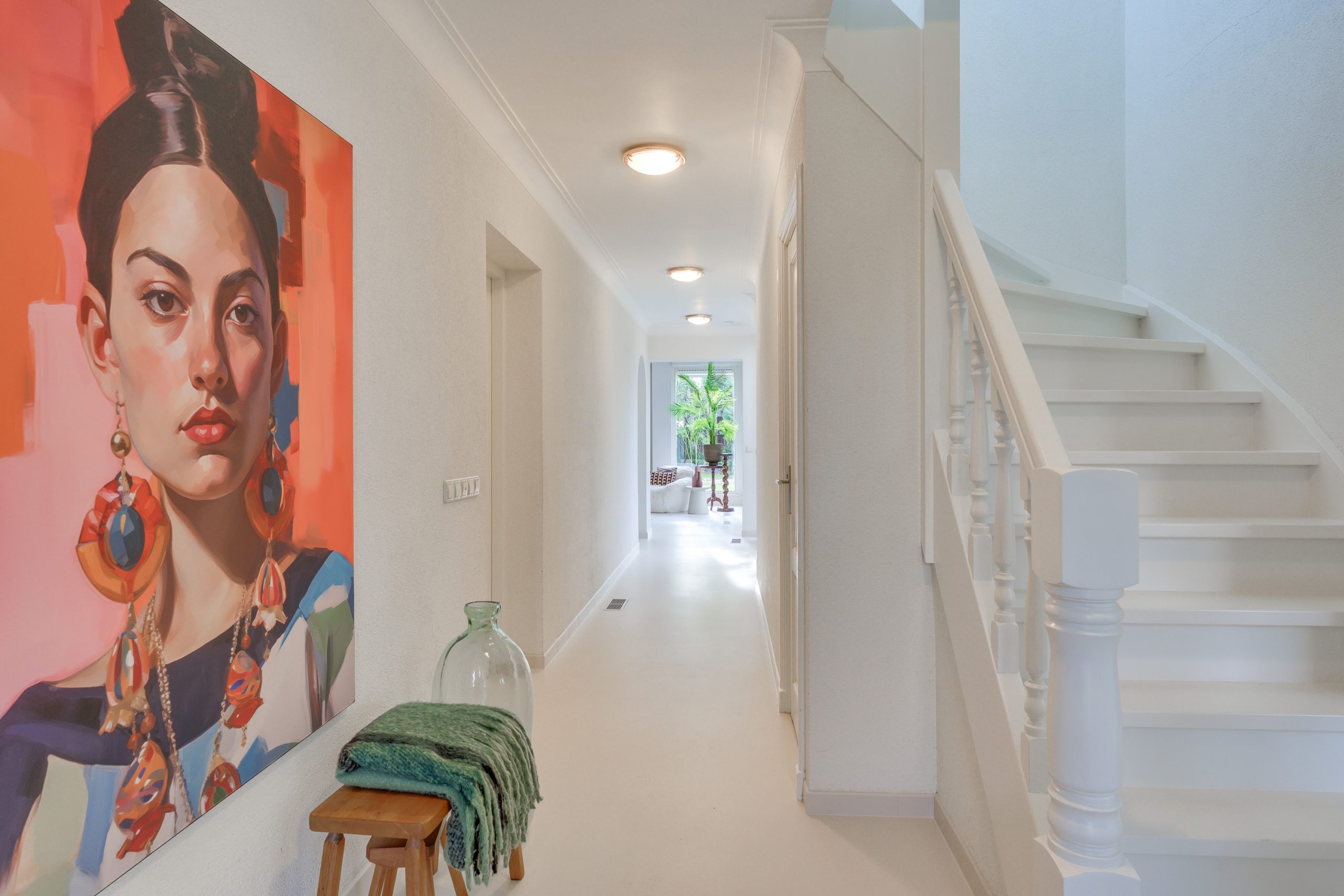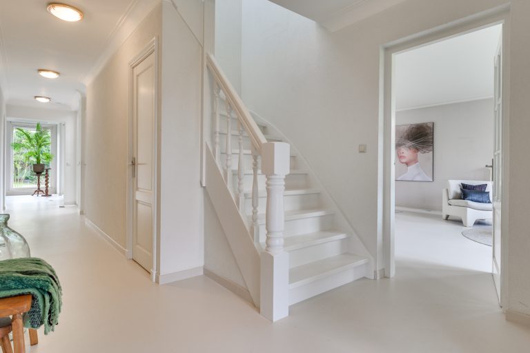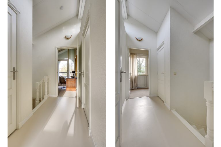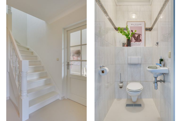 De overdekte entree biedt een beschutte en stijlvolle binnenkomst. Zodra u de woning betreedt, wordt u omarmd door licht, ruimte en rust. De royale hal voelt open en uitnodigend aan en leidt naar alle ruimtes in de woning. De elegante trap naar de eerste verdieping trekt subtiel de aandacht. Onder deze trap bevindt zich een praktische bergkelder.