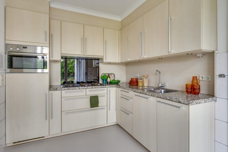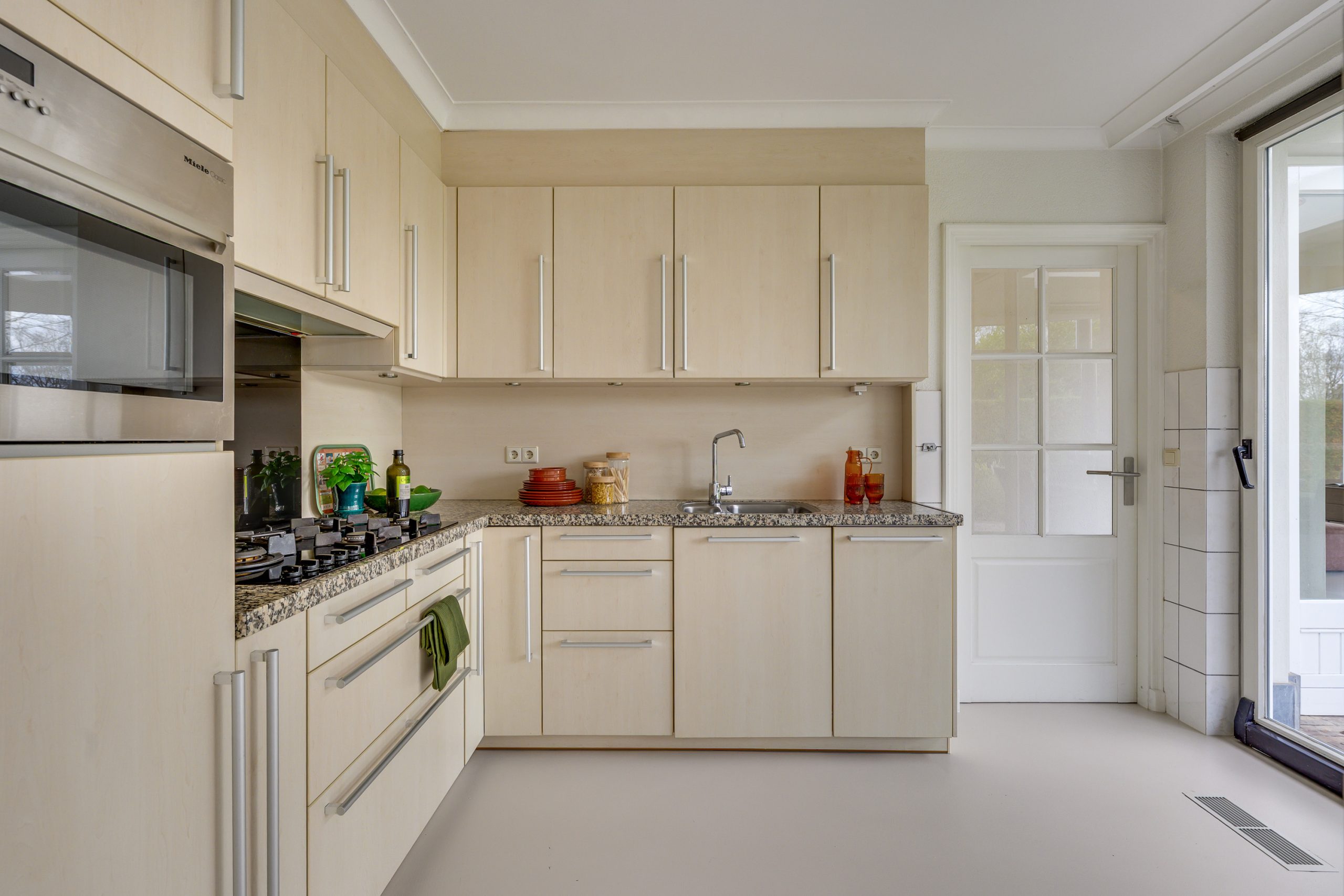 De keuken is verzorgd en smaakvol afgewerkt met een gietvloer en een natuurstenen werkblad. Hier vindt u een 5-pits gasfornuis met afzuiging, combi-oven, vaatwasser, koelkast, een grote spoelbak en een close-in boiler. Vanuit de keuken is zowel de living als de hal bereikbaar. Dankzij de schuifpui staat de keuken in directe verbinding met het grote overdekte terras en de tuin, waardoor binnen en buiten op een natuurlijke manier in elkaar overlopen.