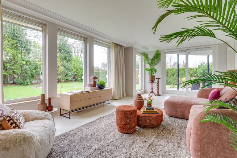 Het overvloedige daglicht, de royale raampartijen en het vrije zicht op de tuin rondom de gehele woning zorgen voor een bijna serene beleving in deze woonkamer. De strakke vloer en de moderne open haard op gas omlijst met hardsteen, vormen een krachtig contrast met de warme uitstraling van de hardhouten kozijnen en subtiele klassieke details. De dimbare verlichting draagt bij aan een warme en aangename ambiance. Via open verbindingen staat de living in direct contact met zowel de keuken als de hal en via een schuifpui met het terras. Alles klopt hier. De ruimte voelt licht, harmonieus en vanzelfsprekend aan – een plek waar sfeer, comfort en architectuur samenkomen en waar u het wonen werkelijk kunt voelen.