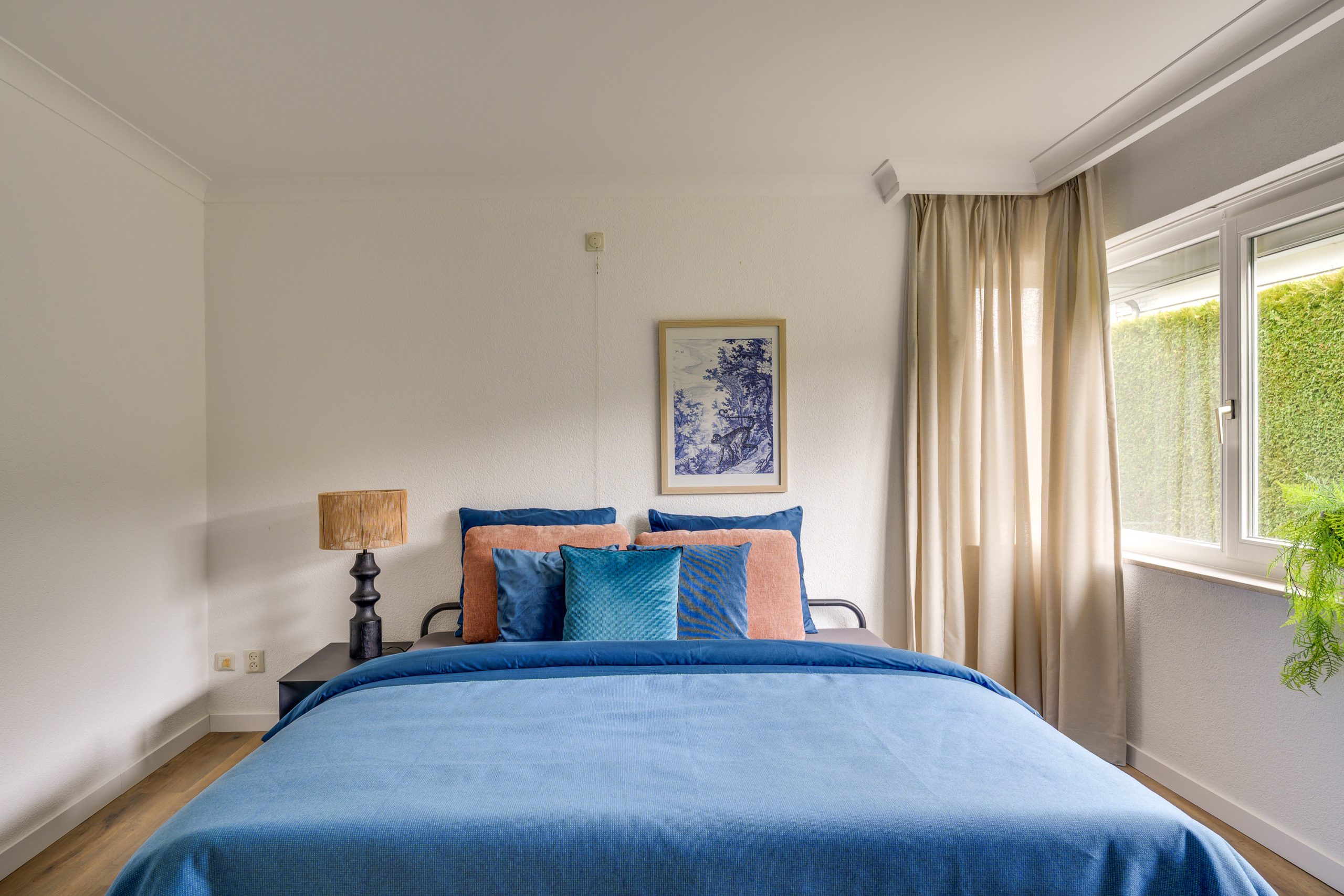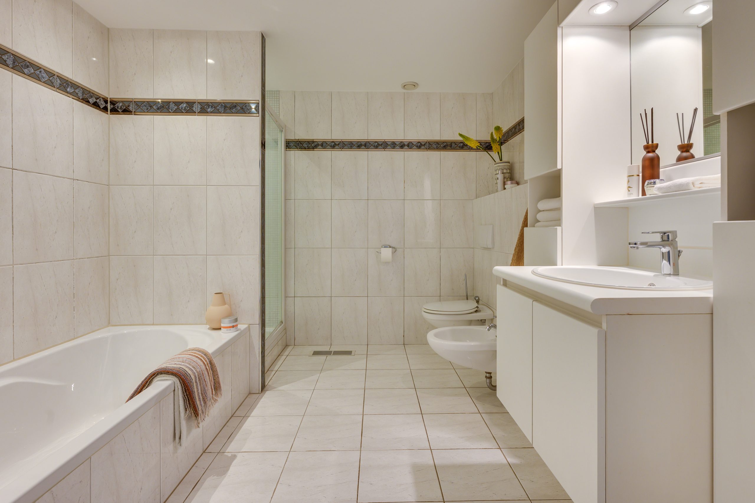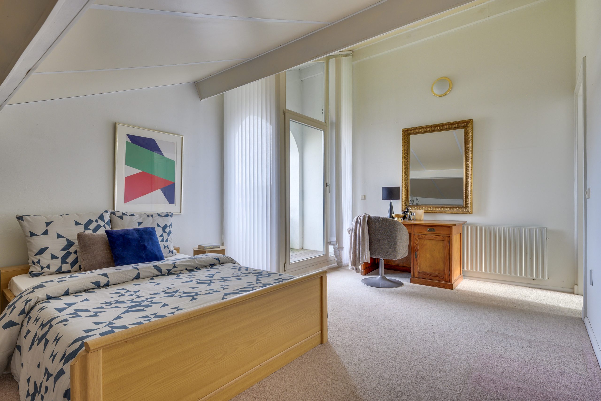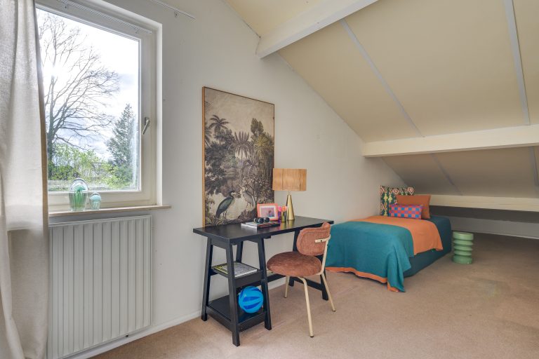 De zeer ruime slaapkamer op de begane grond is een rustige en comfortabele ruimte met een prettige, ontspannen sfeer. Het draaikiepraam zorgt voor veel daglicht en is voorzien van een rolluik. De pvc vloer draagt bij aan een warme en verzorgde uitstraling. De ensuite badkamer is verzorgd en compleet uitgevoerd. De ruimte is volledig betegeld en voorzien van mechanische ventilatie met een comfortabel ligbad, een separate douchecabine, een wandcloset en een bidet, aangevuld met een wastafel met bijpassend meubel.
