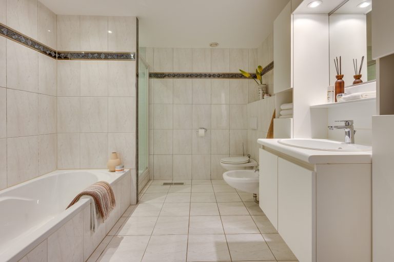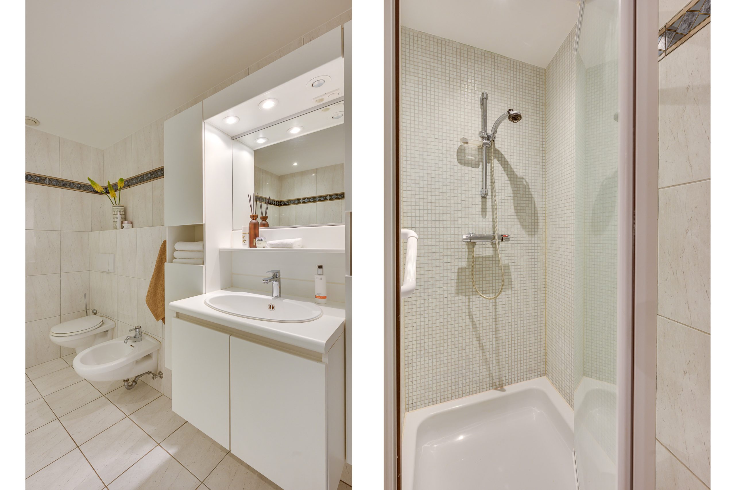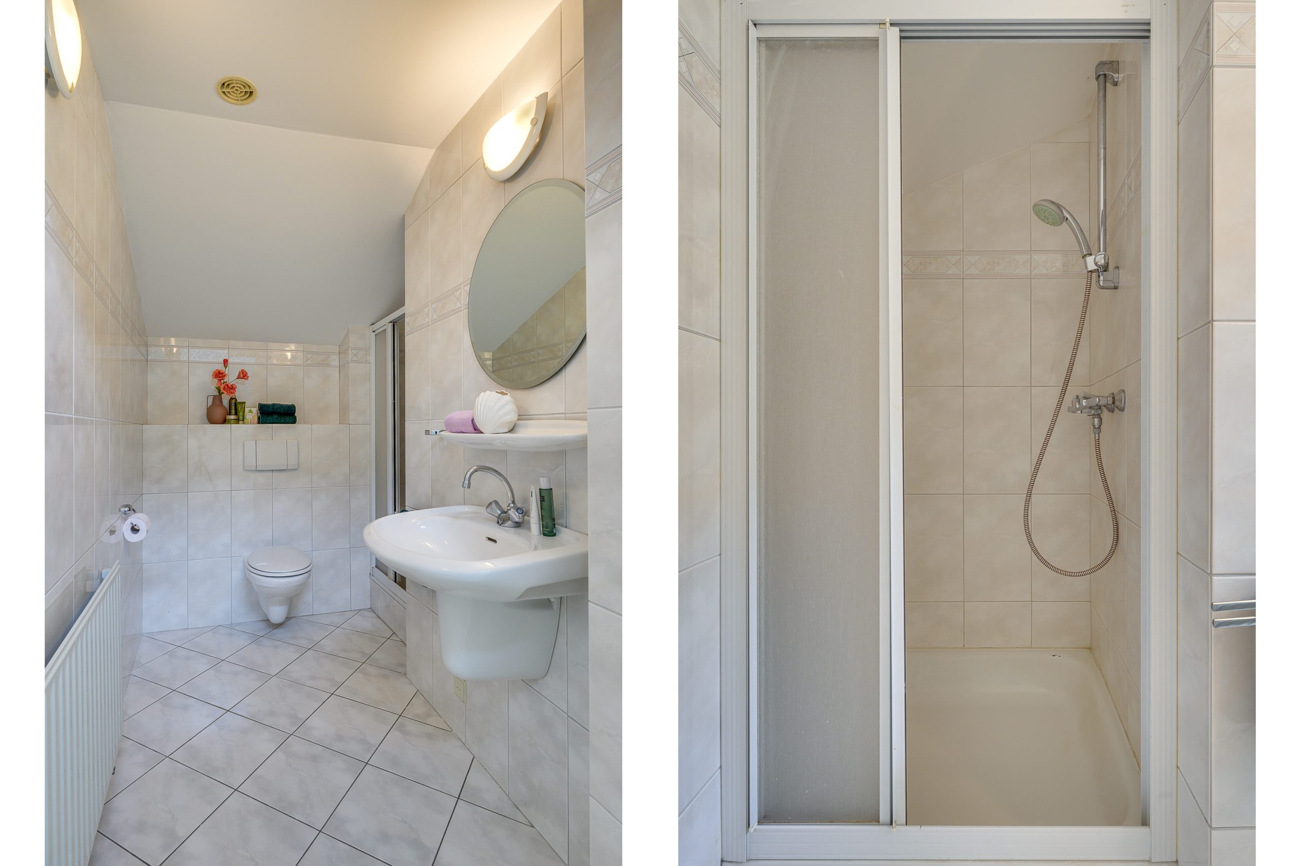 De badkamer is volledig betegeld en voorzien van mechanische ventilatie, een douchecabine en een wastafel.