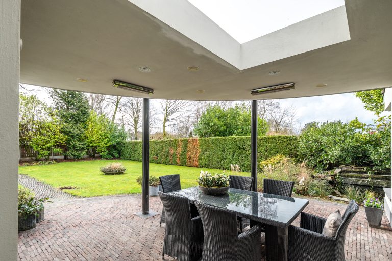 Deze tuin is een oase van groen en privacy. Tussen de volwassen bomen, bloeiende rododendrons en de cypreshaag ontstaat een beschutte, idyllische buitenruimte waar u in alle rust kunt genieten. De overdekte zithoek met verlichting en elektrische terrasverwarming nodigt uit tot lange avonden, terwijl de vijver met waterval een zachte, natuurlijke dynamiek toevoegt. Met een buitenkraan en een poort naar de oprit aan de rechterzijde is de tuin bovendien praktisch én compleet. Daarnaast is de gehele achtertuin is met een hekwerk achter de cypreshaag onzichtbaar veilig afgezet.
