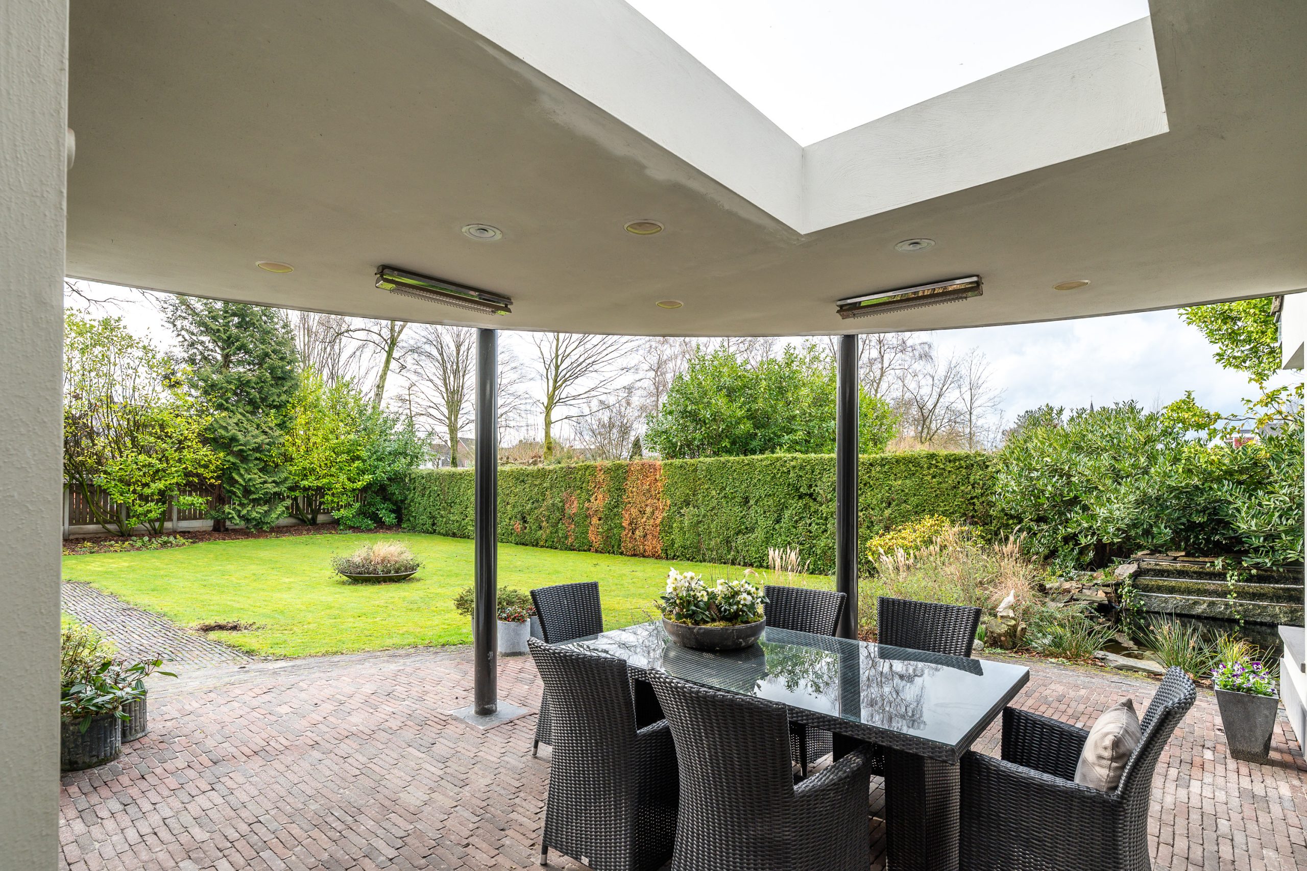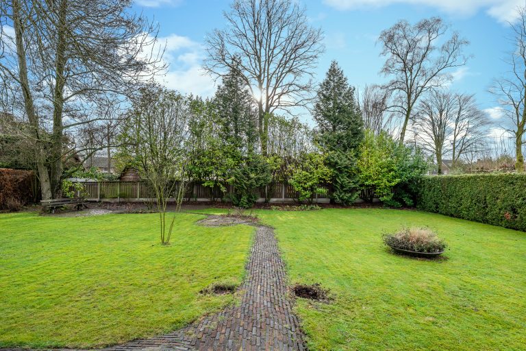 • Diepe en brede groene tuin met volwassen bomen, overkapping, vijver en optimale privacy