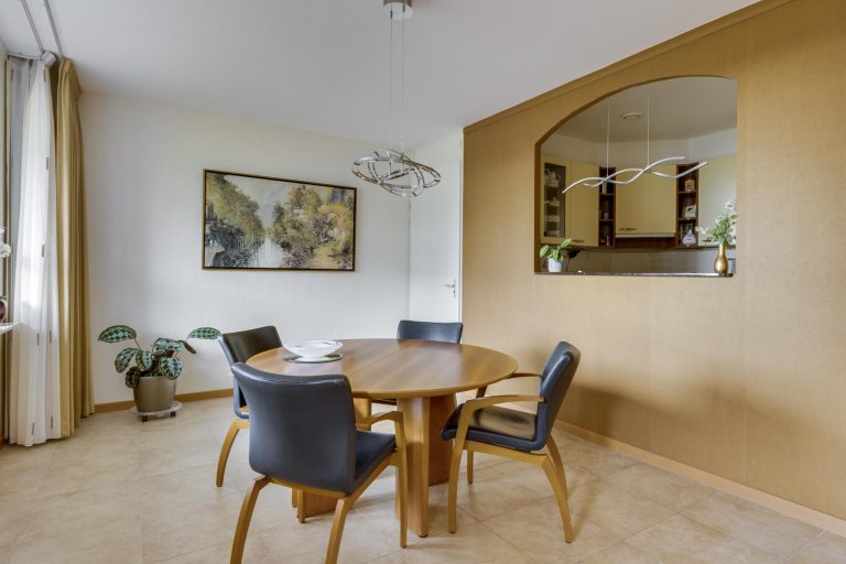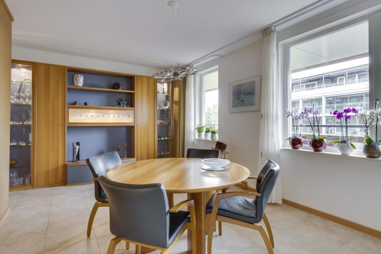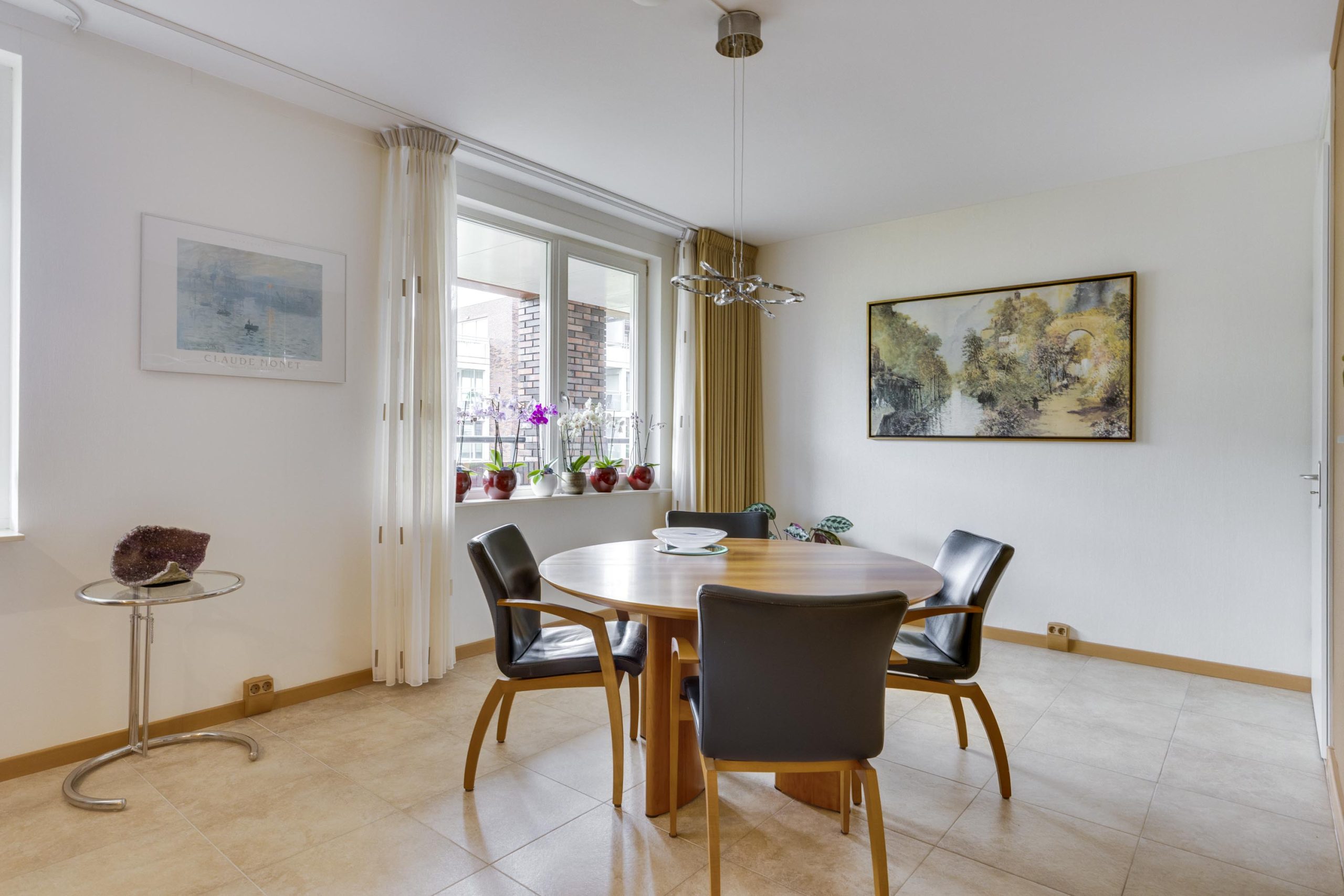 Aansluitend aan de keuken ligt de eetkamer, die veel daglicht ontvangt via onder anderen een groot draaikiepraam. In de hoek van deze ruimte bevindt zich een bergingskast met de moderne meterkast en ventilatie-unit. De tegelvloer loopt drempelloos door in alle ruimtes, wat zorgt voor een harmonieus en ruimtelijk geheel.
