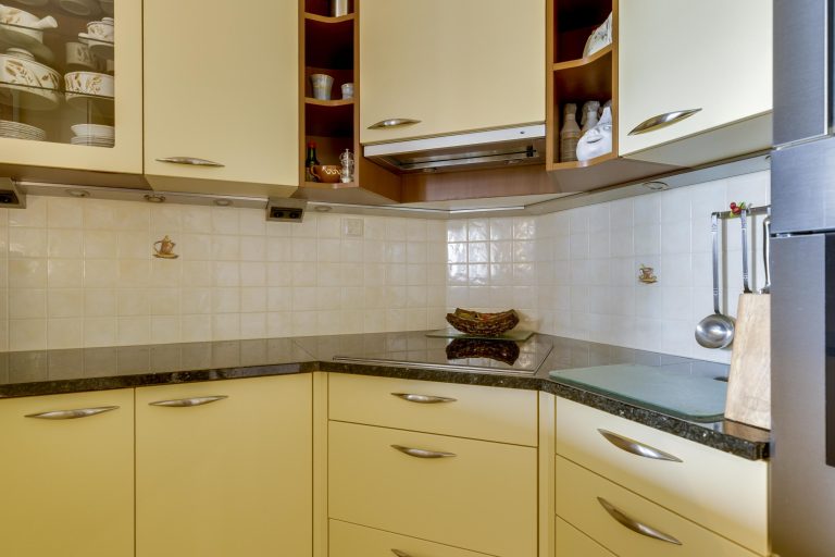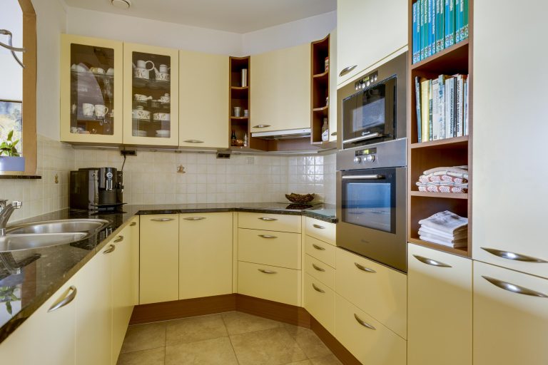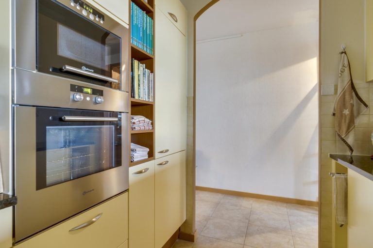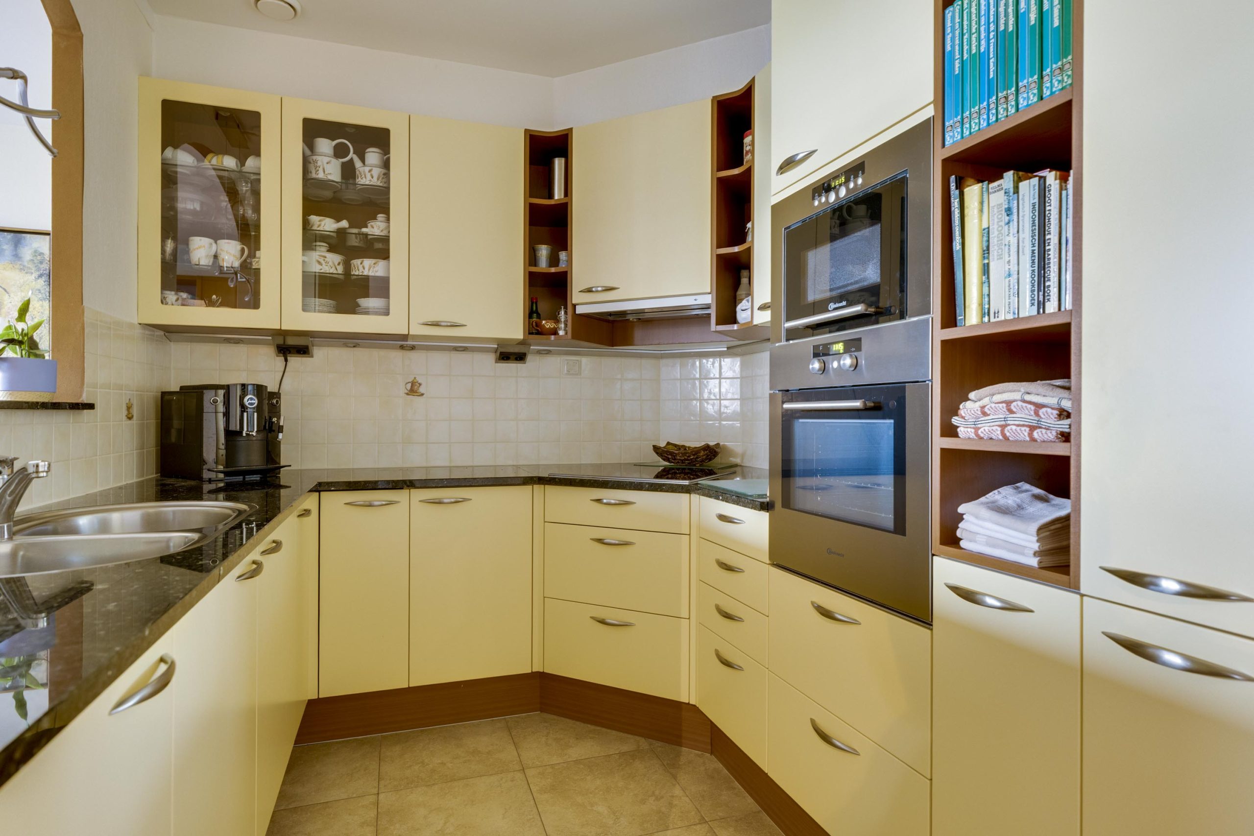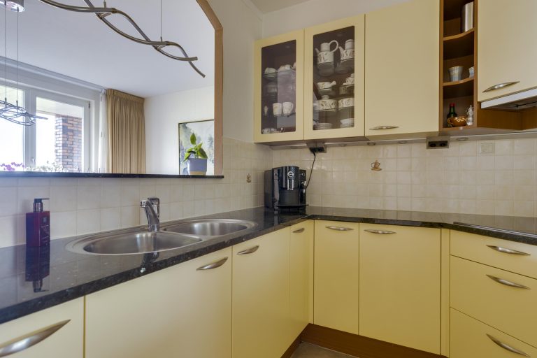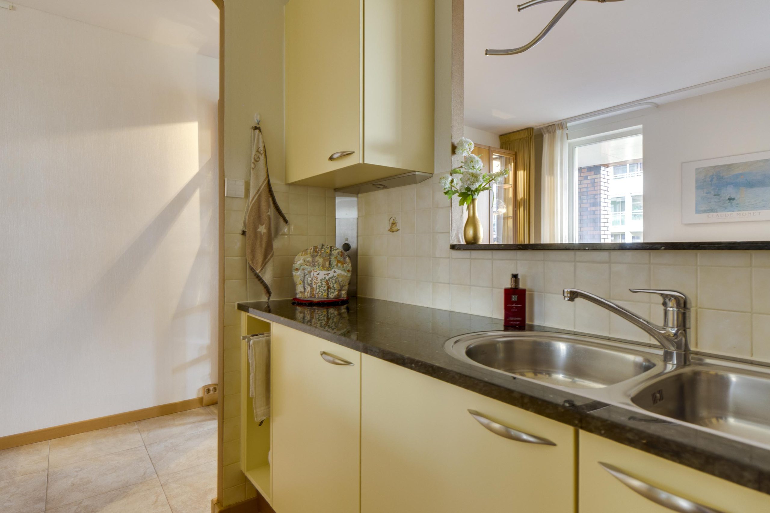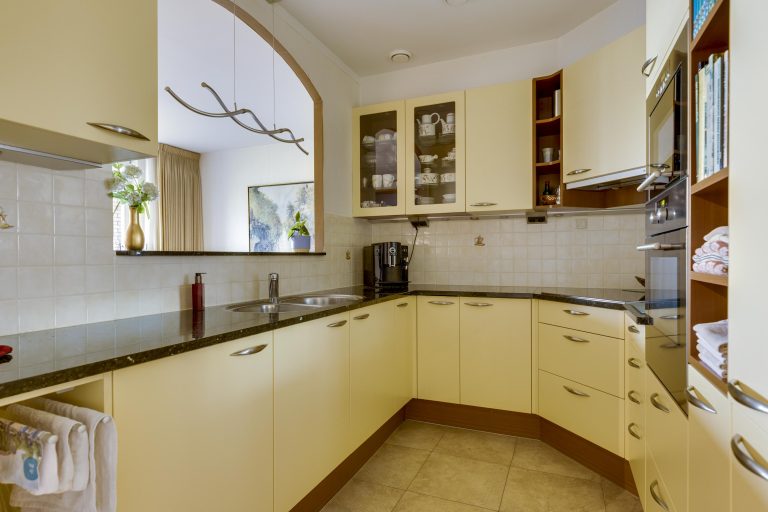 Achter de woonkamer bevindt zich de halfopen keuken. Deze is uitgevoerd met lichte kastfronten en een granieten werkblad in Labrador-uitvoering. De keuken is voorzien van een vierpits inductiekookplaat met afzuigkap, een dubbele spoelbak, ingebouwde oven en magnetron, evenals een grote koelkast en aparte vriezer. Een vaatwasser is nog niet geplaatst, maar de benodigde aansluiting is aanwezig, waardoor deze eenvoudig toegevoegd kan worden.