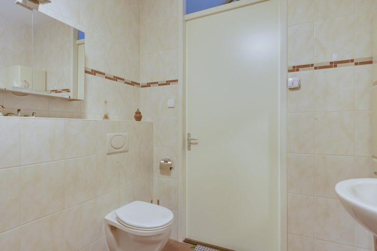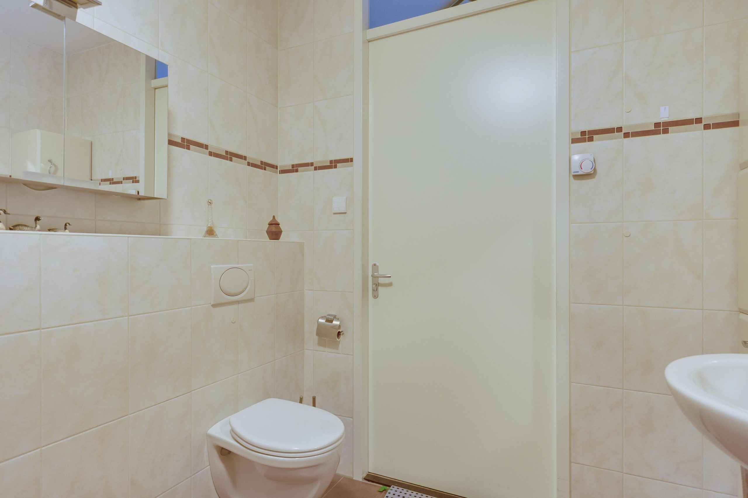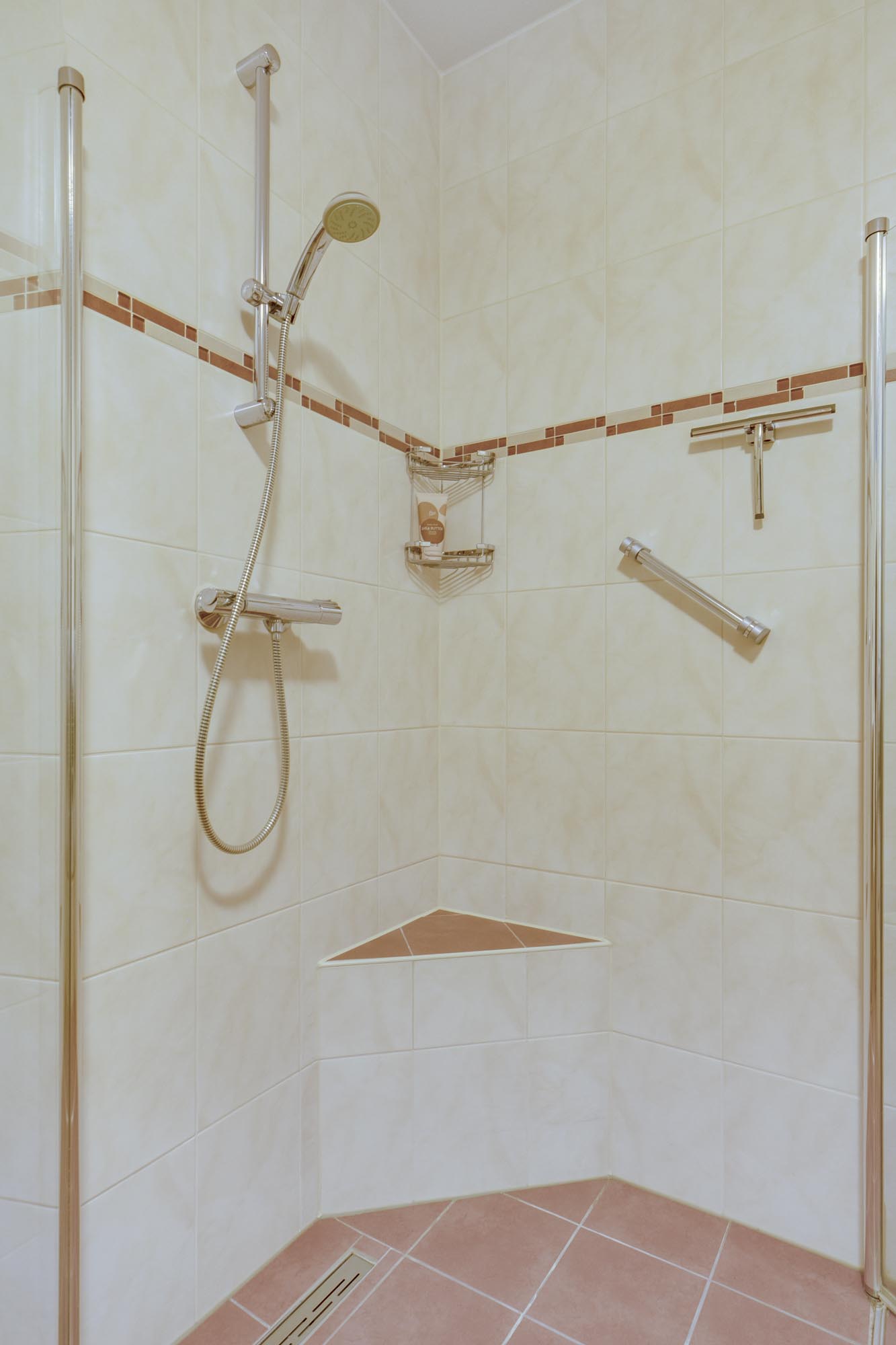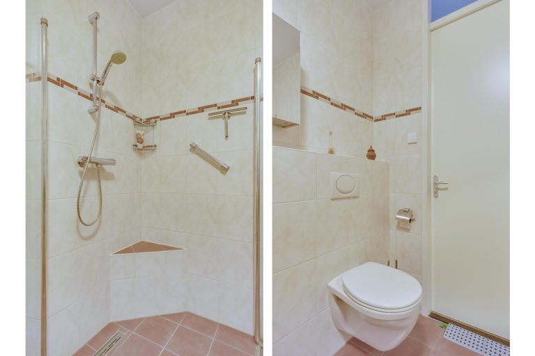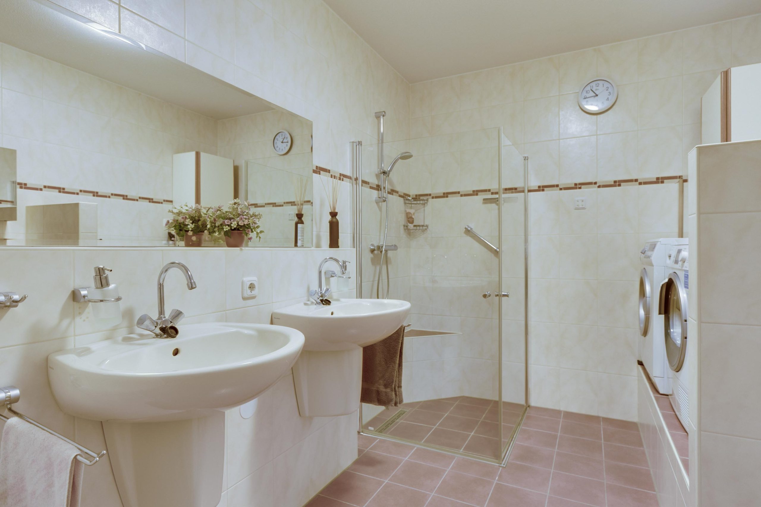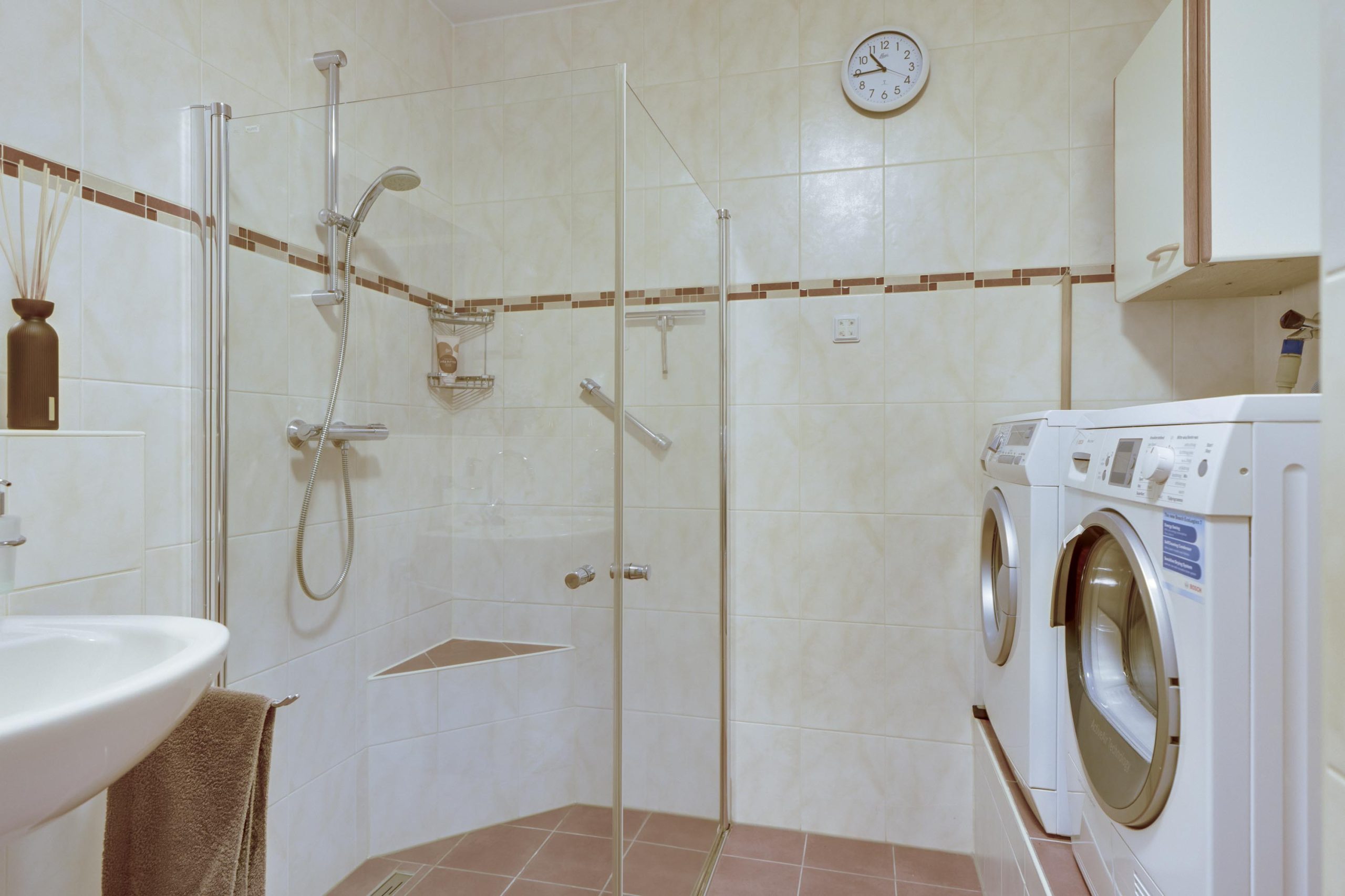 De ruime badkamer ligt centraal tussen de slaapkamers en is volledig betegeld. Deze moderne ruimte is voorzien van mechanische ventilatie, een dubbele wastafel, inloopdouche, toilet en aansluitingen voor wasmachine en droger.