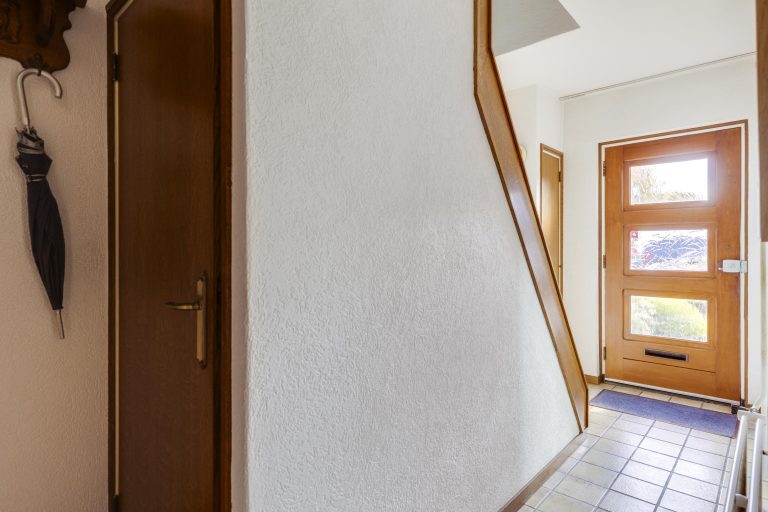 U komt binnen in de hal welke is voorzien van een tegelvloer en toegang geeft tot de meterkast, het toilet, de badkamer en de trap naar de eerste verdieping. Rechts bij binnenkomst bevindt zich de meterkast met moderne slimme meters. Om de hoek van de trap is een handige kapstok en een voorraadkelder met extra bergruimte. Aan het einde van de gang bevindt zich het volledig betegelde toilet met fontein.