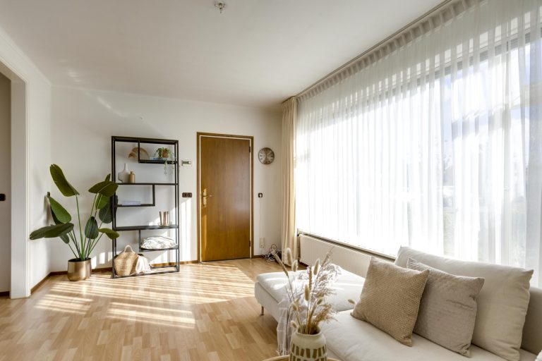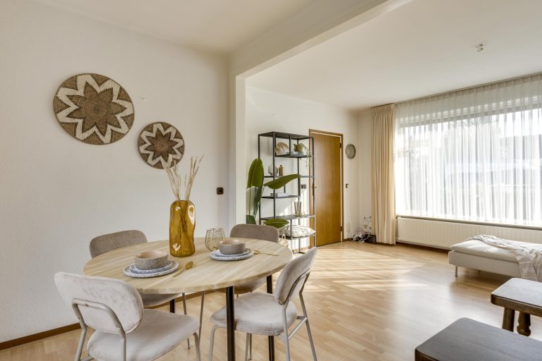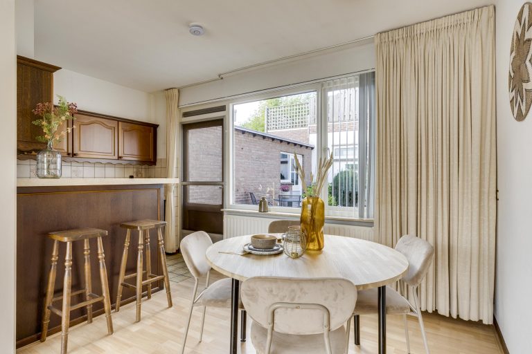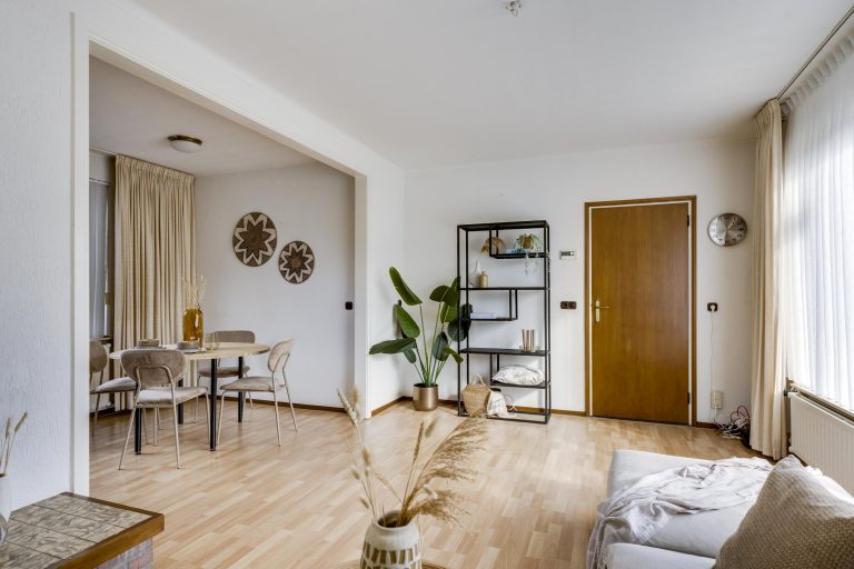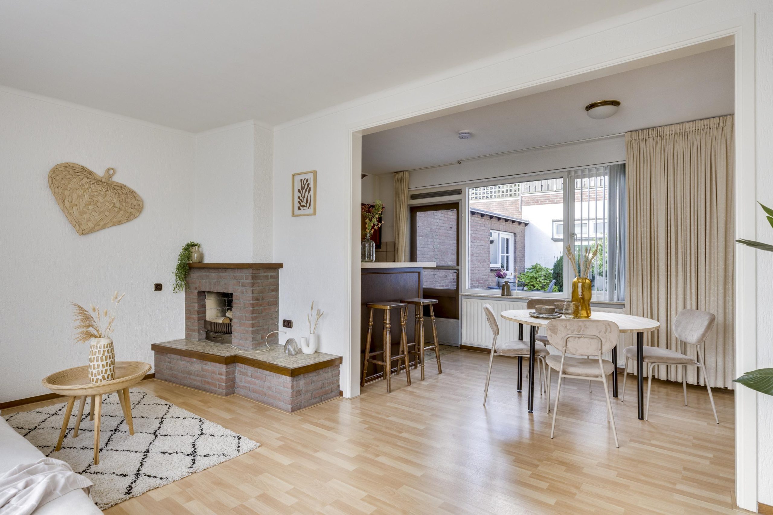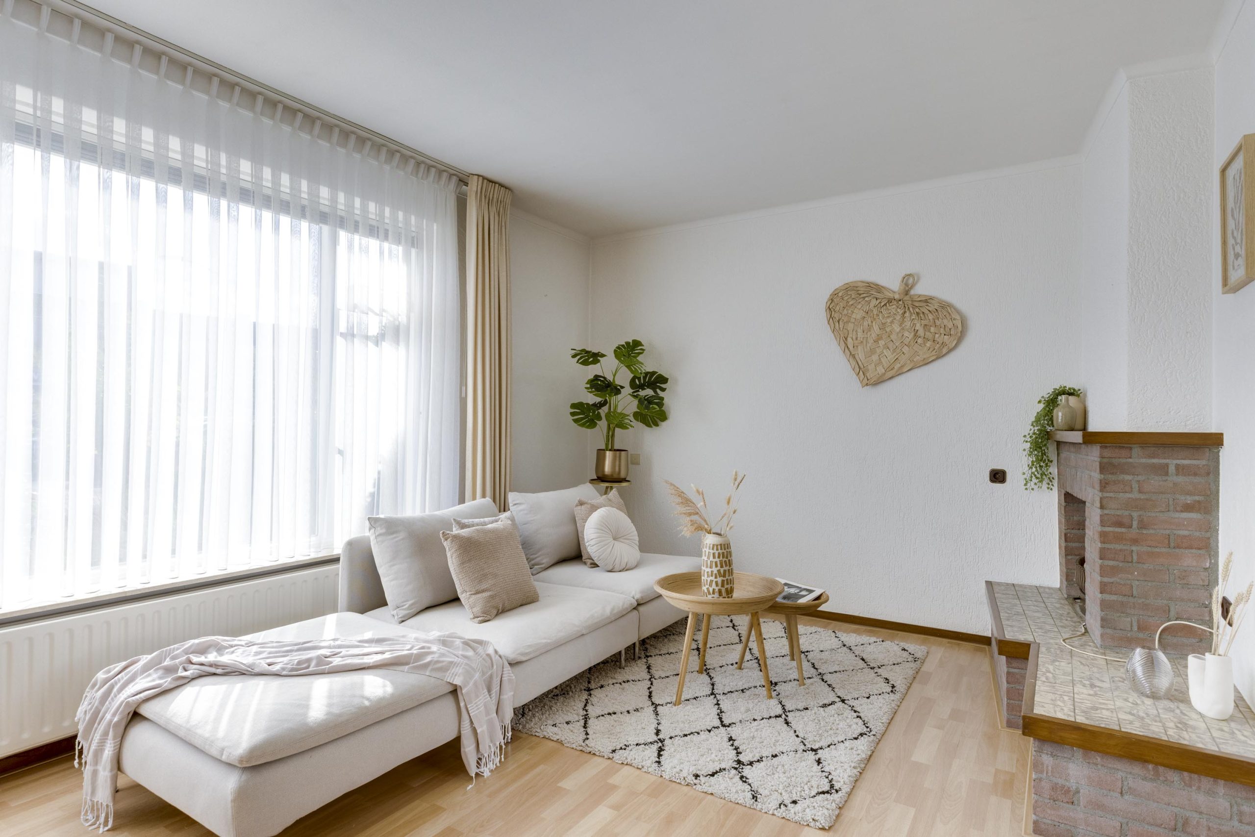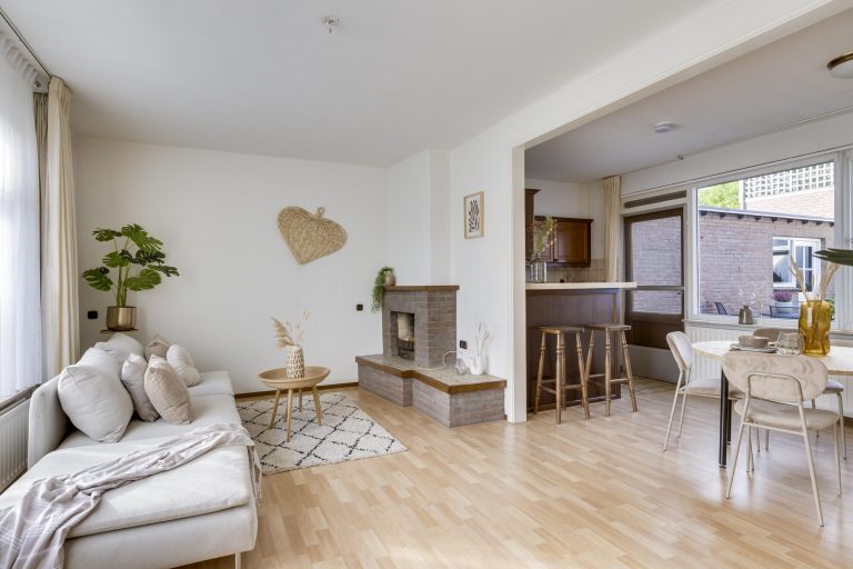 De woonkamer heeft een warme en lichte uitstraling dankzij de lichte laminaatvloer en de grote ramen aan de voorzijde en achterzijde. De kamer heeft een L-vormige indeling, waardoor er een natuurlijke scheiding ontstaat tussen het zit- en eetgedeelte. Er is een open haard met een karakteristieke bakstenen ombouw die zorgt voor een gezellige sfeer. Aan de voorzijde is een elektrische zonwering aanwezig en aan de binnenzijde zijn jaloezieën geplaatst. Ook aan de achterzijde is een elektrische zonluifel aanwezig.