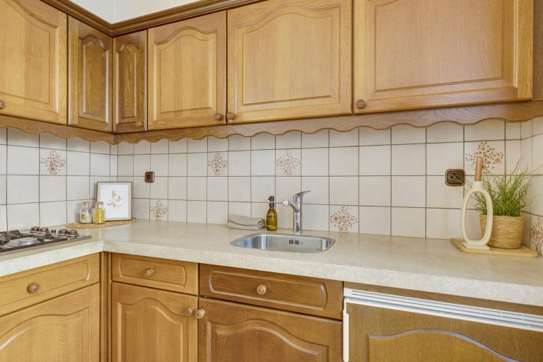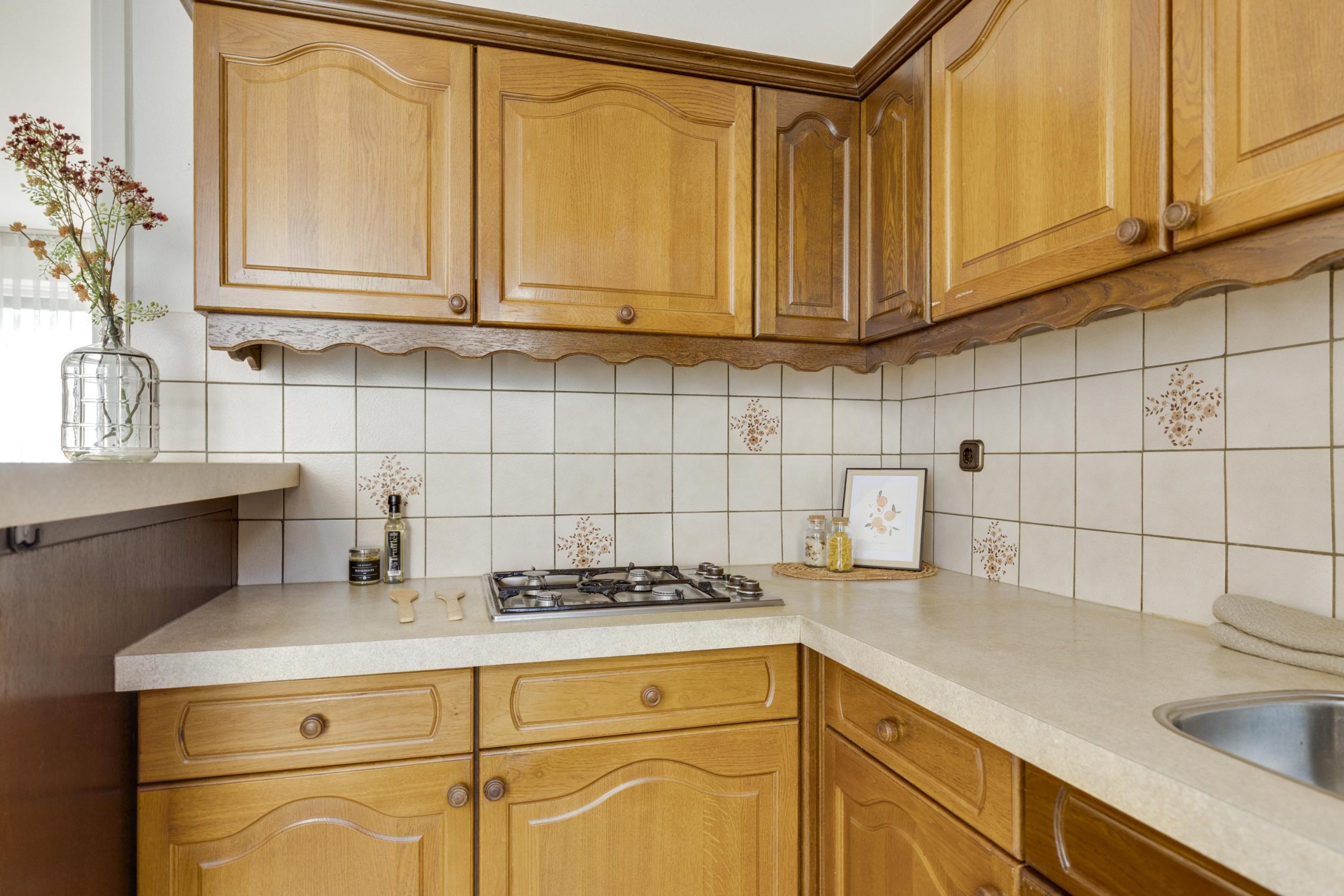 De keuken is eenvoudig uitgevoerd en heeft een praktische U-vorm met een bargedeelte. De keuken beschikt over een 4-pits gaskookplaat, afzuigkap, gootsteen en een ingebouwde koelkast. De vloer is voorzien van tegels. Via een deur is er directe toegang tot de achtertuin.