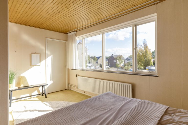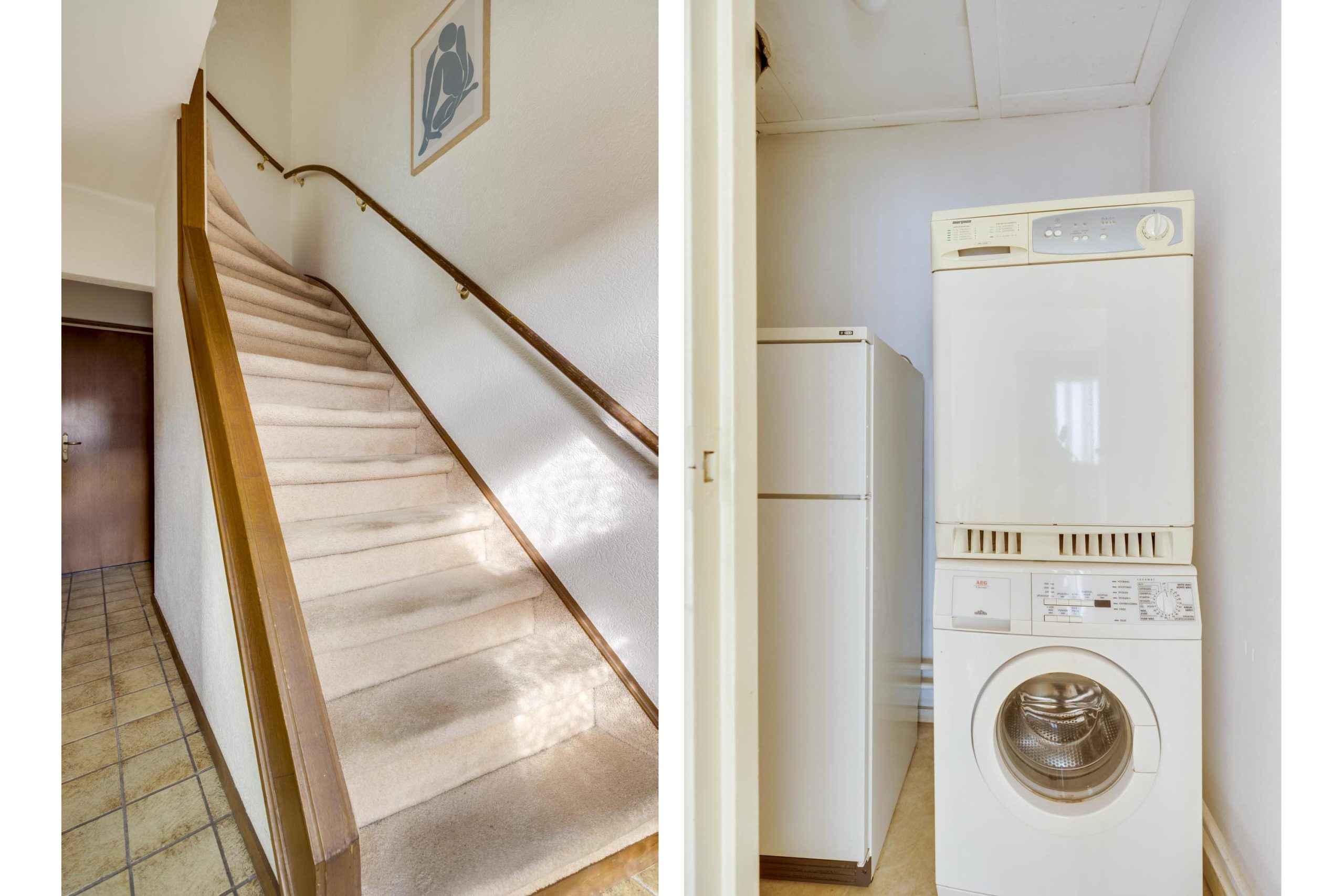 Op de eerste verdieping bevindt zich links de ruimte waarin een CV ketel geplaatst is met de mogelijkheid om een aansluiting te realiseren voor wasmachine en droger en voldoende plek voor een combi-koelkast met vriezer. Vanuit deze ruimte is de bergzolder bereikbaar. De eerste slaapkamer aan de achterzijde heeft een raam dat op kierstand geopend kan worden en beschikt over een wateraansluiting, ideaal als logeerkamer, hobbyruimte of kleine badkamer. De tweede slaapkamer, eveneens aan de achterzijde, is ruim van formaat en biedt uitzicht op de knusse achtertuin. De derde slaapkamer aan de voorzijde is de grootste kamer, heeft grote ramen en een inbouwkast. De gehele verdieping is voorzien van vloerbedekking en een houten schroten plafond. Op de overloop bevindt zich eveneens een inbouwkast voor extra bergruimte.