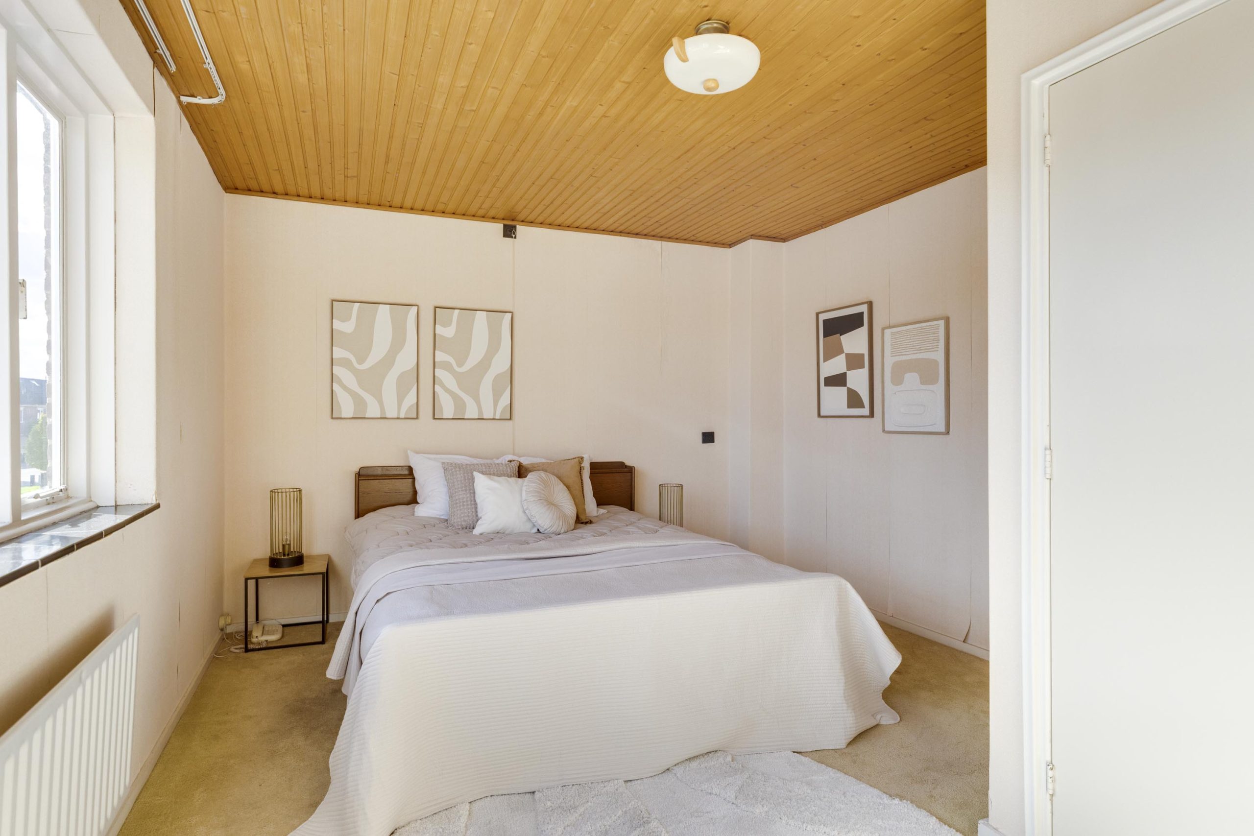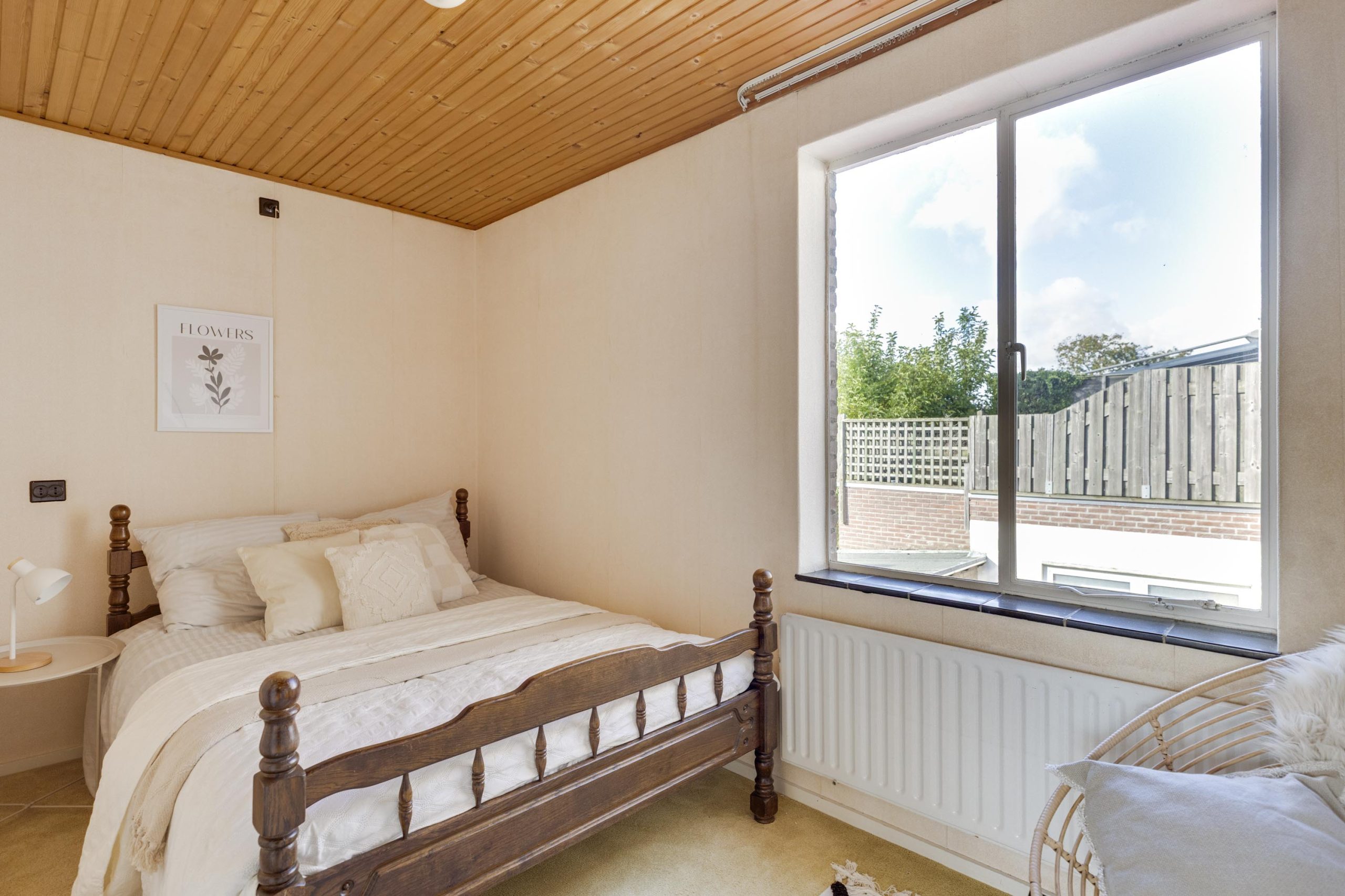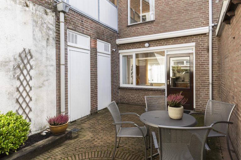 Via de keukendeur met hor bereikt u de patio-achtige tuin met een knusse en besloten sfeer, ideaal voor een zitje in de zon. De achtertuin is grotendeels bestraat en omringd met groenaccenten. Links bevindt zich een stenen berging voorzien van elektra.